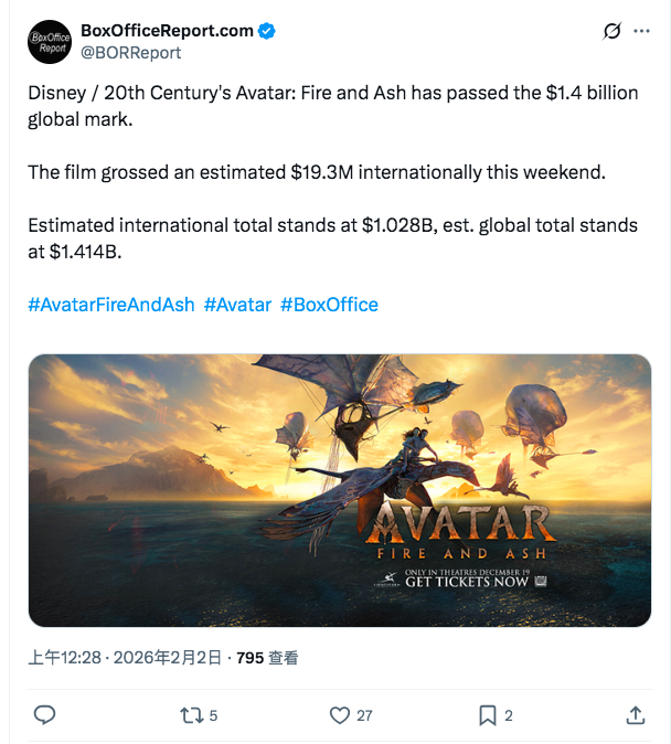 TNABO《阿凡达:火与烬》全球票房截至周日结束共计14.14亿美元,其中3.