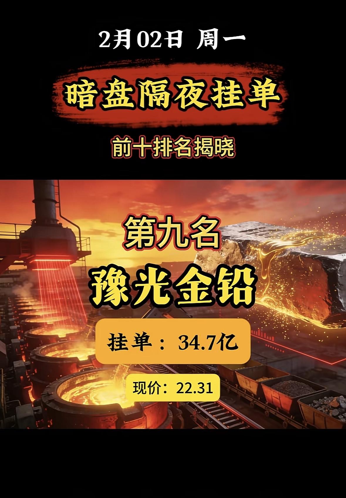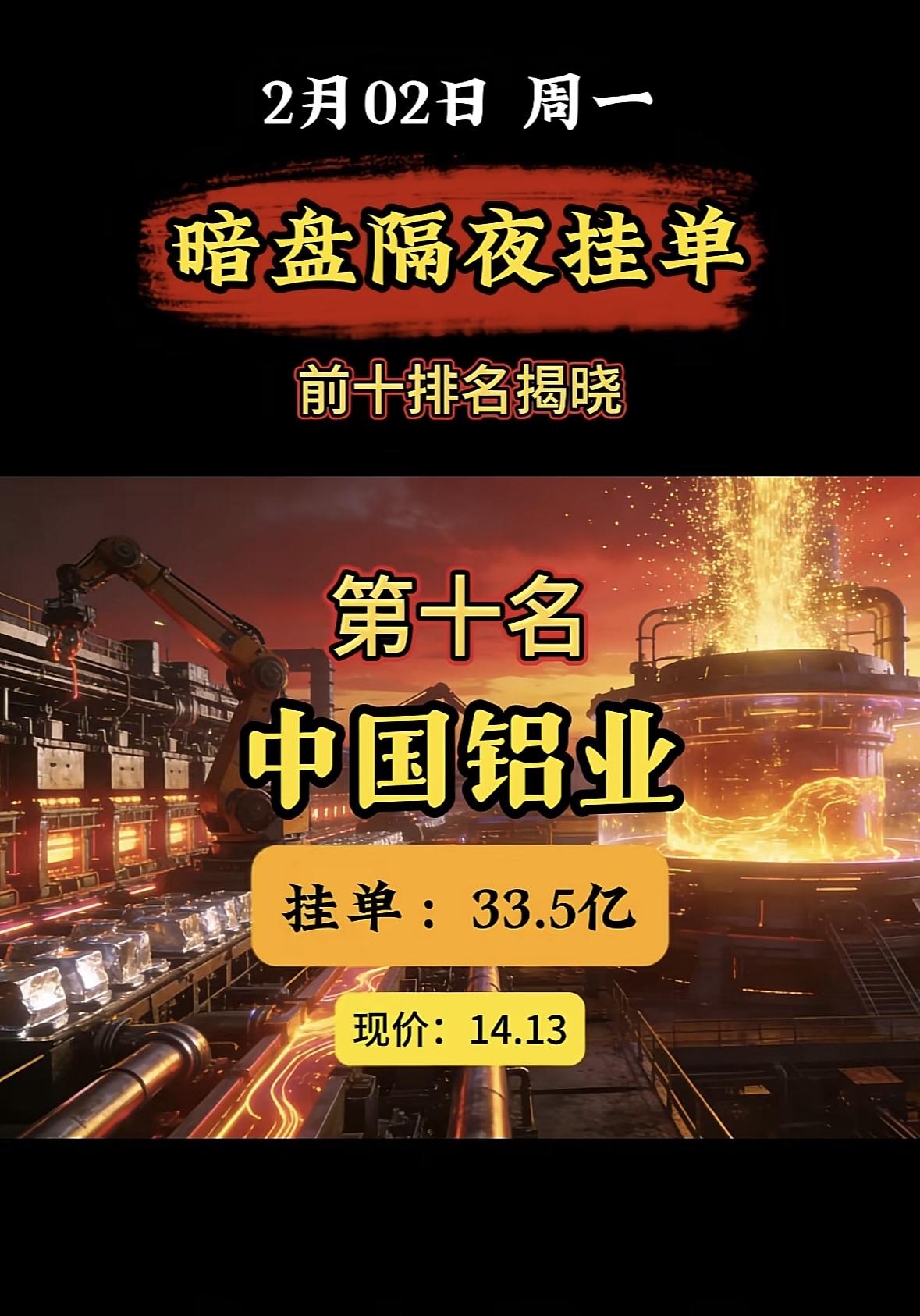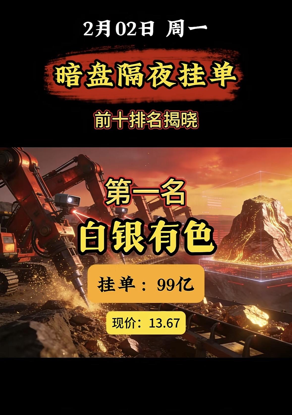 2月2日暗盘隔夜挂单榜首:中国铝业,33.5亿现价14.13 "白银有色登顶暗盘榜首,挂单近百亿现价亮眼" "白银有色登顶暗盘榜首,近百亿挂单抢筹,现价稳居高位。"
