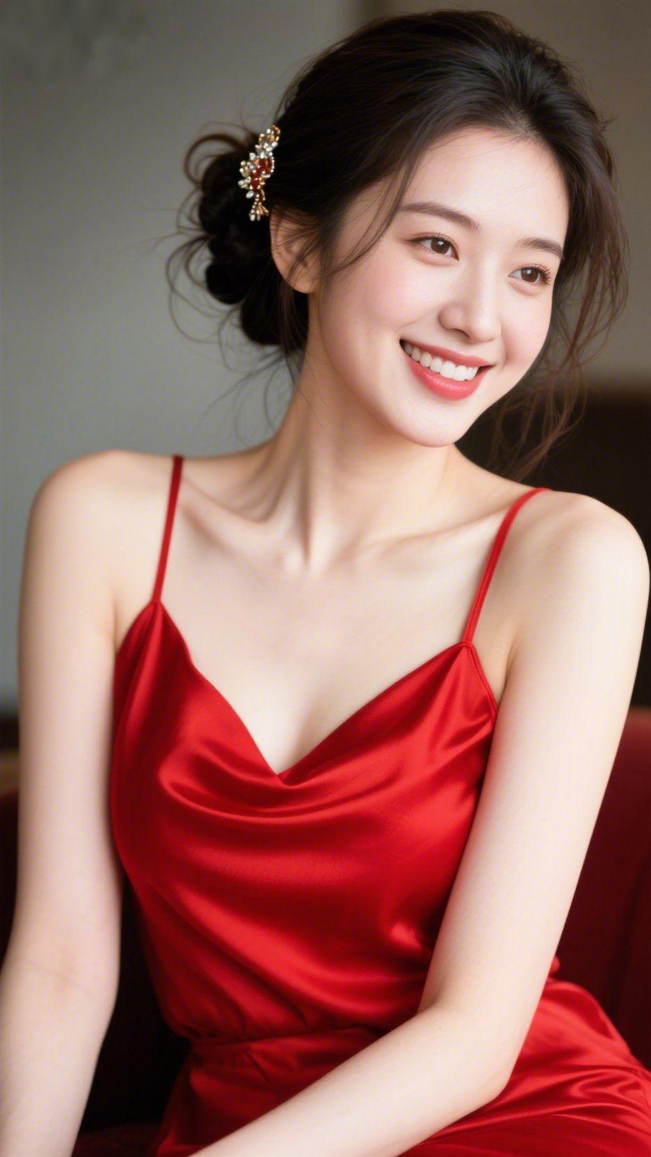 红裙栖暖室柔光中 暖光漫过软榻,她抬眸时,红裙裹着缎面的柔,细带轻垂如碎落的霞,与鬓边饰光融作室间的温。 并非夺目亮色,是浸了烟火的软:发间花饰沾着空气的暖,笑意舒展时,连室内的风都轻缓下来,似不忍打破这抹平和。几缕碎发垂落肩侧,衬着衣料的光,把时光的静收在衣角。 这一幕里,无喧闹刻意,只有衣与室的相衬:红的暖、光的柔、室间的宁,织就日常里撞入眼帘的软。原来好光景从非孤景,是有人坐于暖室,让烟火与衣色都沾了生活的和软。 抬眼时,空气里浸着室间的轻暖。 红裙伴暖室柔宁 室间衣色融温