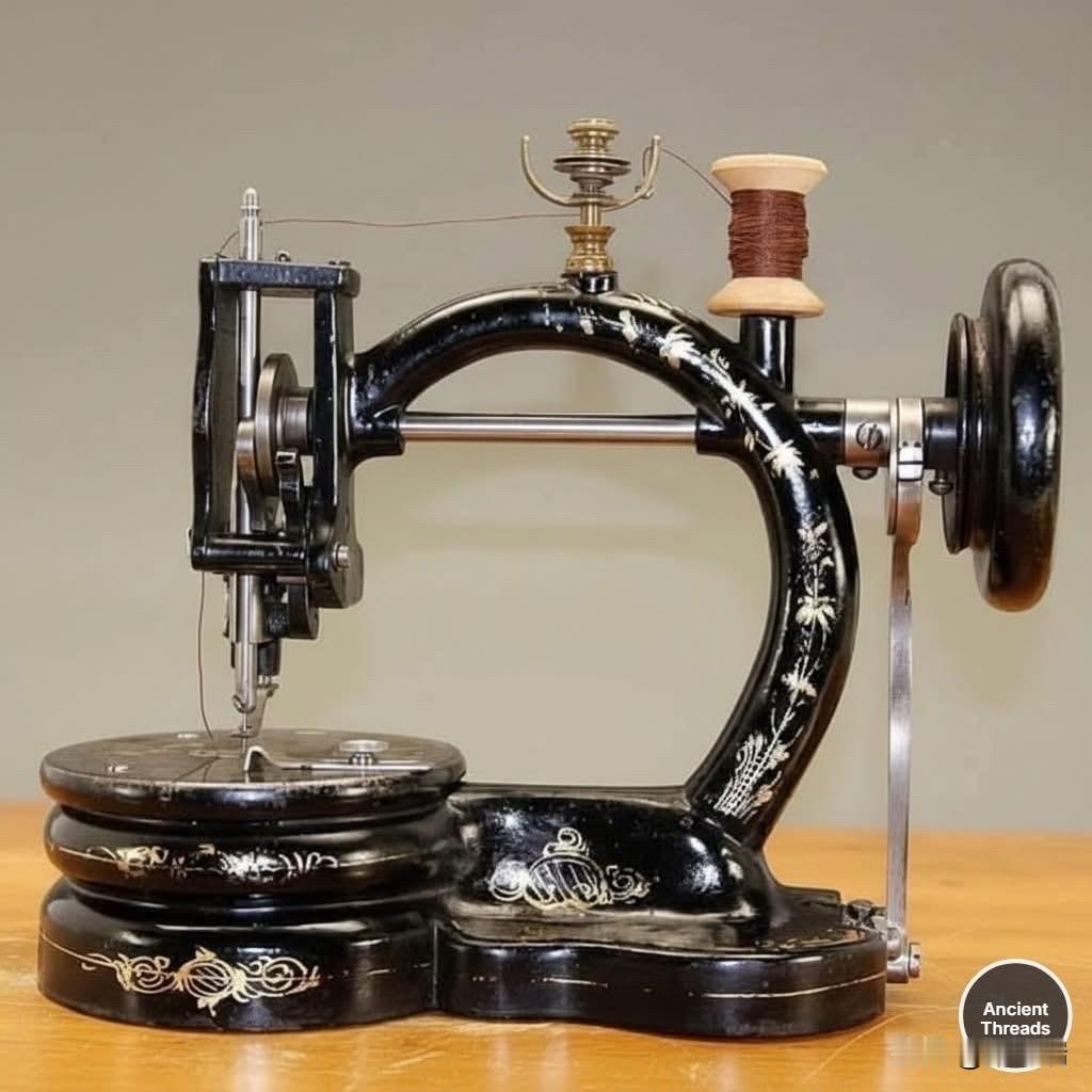 十九世纪的手摇缝纫机,难得一见:这台缝纫机是1867年的Buckeye缝纫机(Buckeye Sewing Machine)。 制造商: 这款机器最初由位于俄亥俄州克利夫兰的 W. G. Wilson 制造。 专利: 它是根据约翰逊(Johnson)于1867年4月18日获得的扩展专利授权生产的。 它是一款古董手摇缝纫机,采用两根线和一个梭子形成曲折缝(lockstitch),机器主体为黑色,带有装饰性的金色花纹点缀。 在19世纪,这种小巧的手摇机器因其耐用性和工艺而备受推崇,代表了缝纫技术史上的重要一步,早于电动缝纫机。