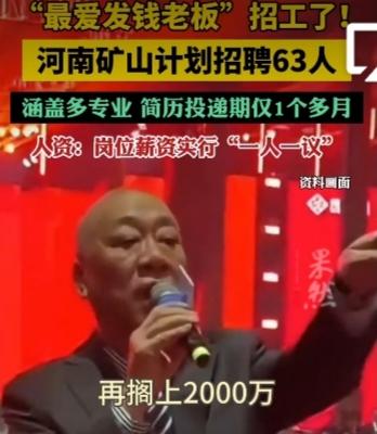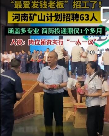 “最爱发钱老板”招工了!河南矿山计划招聘63人,涵盖多专业,简历投递期仅1个多月——消息一出,求职群直接炸锅,HR电话被打爆到占线,网友直呼“这哪是找工作,分明是抢通往幸福的船票”! 谁能拒绝这样的神仙企业?年利润2.6亿敢拿1.7亿分给员工,年终奖现金堆成山,数钱比赛数多少拿多少,最高能拎走15.7万;中秋请19000多人吃千人宴,给每位员工父母发600元红包,连续13年雷打不动 ;就连春节礼包都暗藏惊喜,36万枚“国字号”鸡蛋溢价70%收购,只为让员工吃到最好的。更绝的是“三无管理”:不打卡、无严苛KPI、不随便罚款,下雪天直接放假工资照发,免费食宿配齐空调独立卫浴,连孝心工资都直接打给员工父母。 这哪里是上班,分明是被企业“宠上天”!要知道现在多少打工人顶着996的压力,拿着微薄的薪水,还得忍受画饼式管理。而河南矿山用“挣一块分八毛”的实在,打破了“老板赚钱员工喝汤”的魔咒——焊工年薪能达30万,普通工人月入七八千,员工流失率不到5%,人均产值比同行高一倍。 此次63个名额涵盖电气工程、机械工程等多专业,虽然要求“成手”优先、薪资一人一议,但谁不想抓住这个“被钱砸中”的机会?不过也有网友调侃:“简历已经投了,就怕竞争比高考还激烈”“这样的老板能不能批量复制?” 你觉得这样的神仙企业难进吗?如果是你,会放弃现有工作去冲刺吗?欢迎在评论区聊聊。河南矿上老板 河南矿山企业