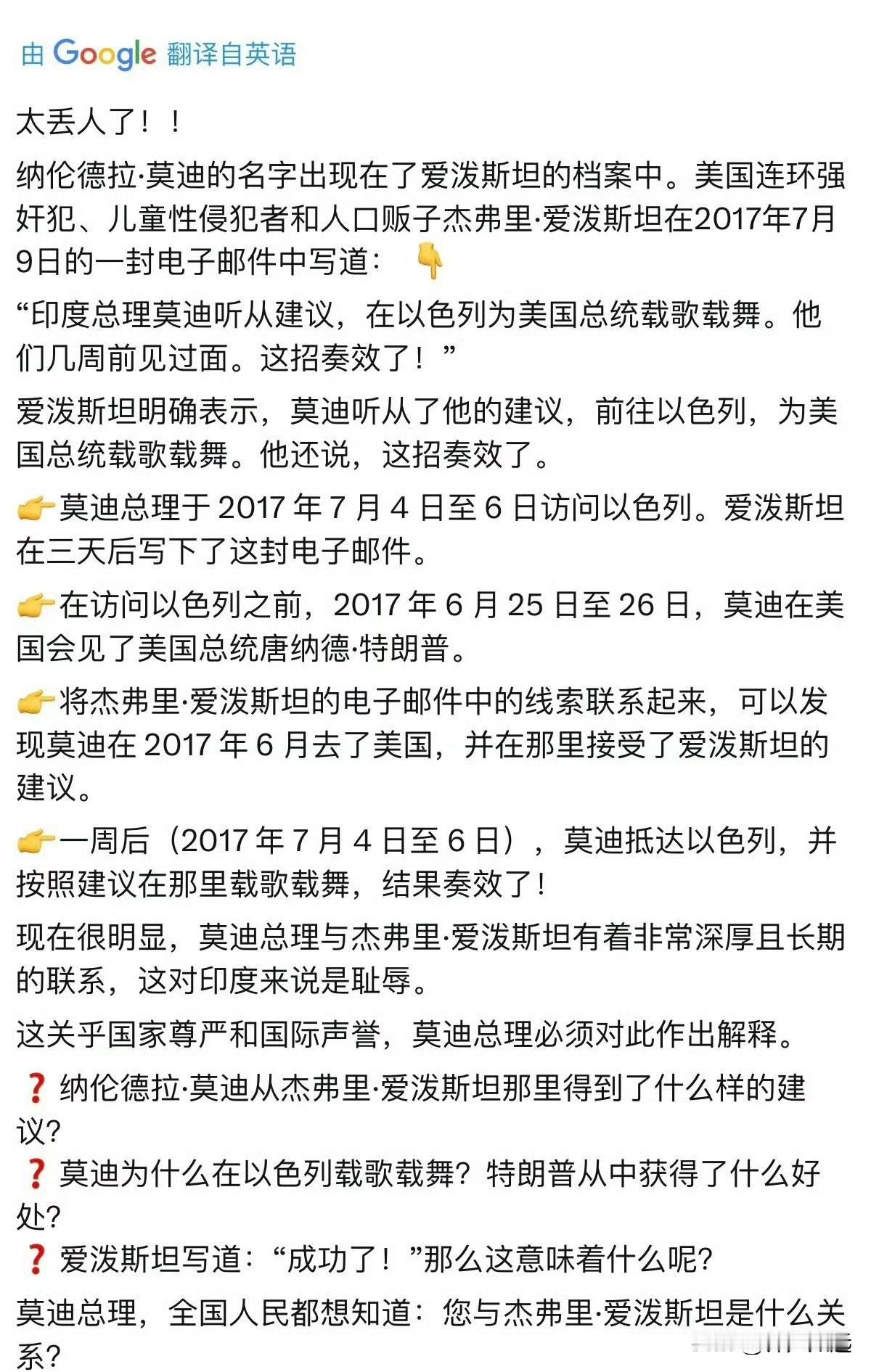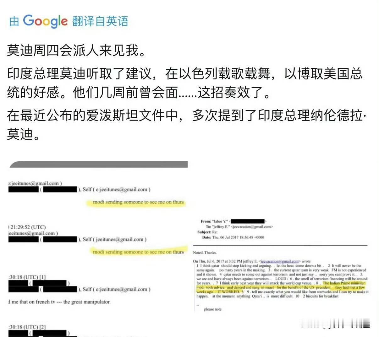 爱泼斯坦关于莫迪跳舞的邮件曝光,印度电影能歌善舞但莫迪跳舞有啥好看的? 不过爱波斯坦和莫迪居然有联系,这倒是挺惊讶的。 邮件里说印度总理莫迪听取了建议,在以色列唱歌跳舞给美国总统看。 如果是真的就太羞了, 印度国内舆论已经开始发酵了, 这和莫迪一向的人设截然相反, 和爱泼斯坦这样声名狼藉的人有联系并且征求意见绝对是个丑闻。 印度外交部第一时间出来否认称: “除了莫迪2017年7月正式访问以色列的事实之外, 邮件中其他的暗示不过是一名被定罪的罪犯的低劣臆测,理应被彻底鄙视和驳回。” 不过印度电影能歌善舞是出名的,跳一段也不是不可能[大笑]