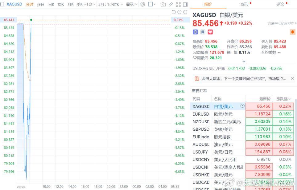 【白银日内转涨】2月2日,现货白银日内转涨,早盘一度跌超10%,现报85.267美元/盎司。 刚买的金饰能退吗 黄金白银又跌麻了 (财联社)