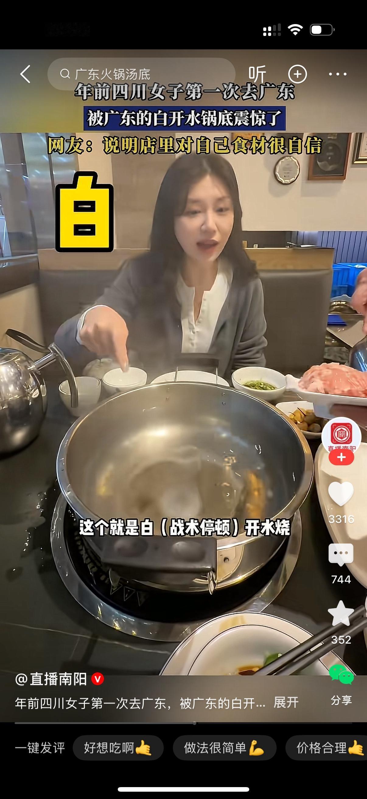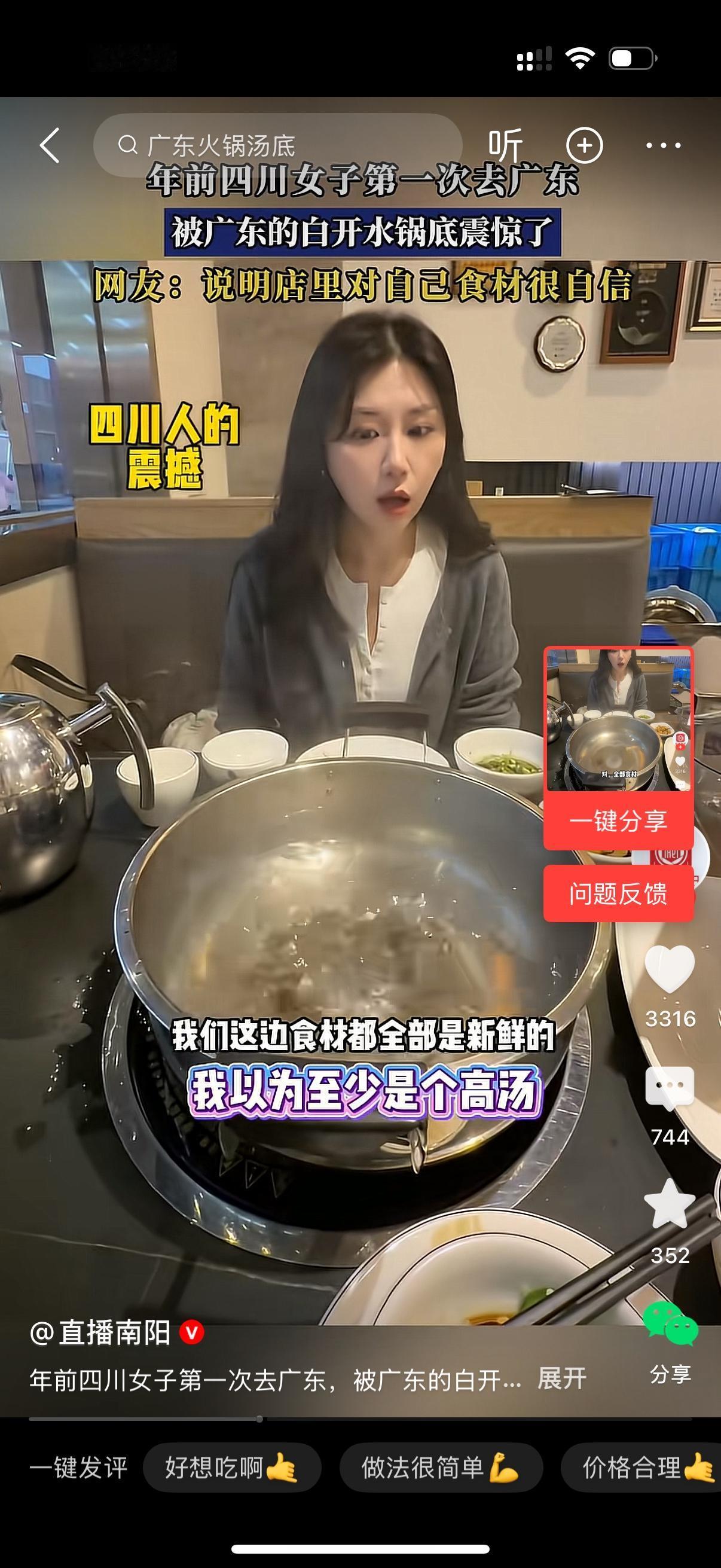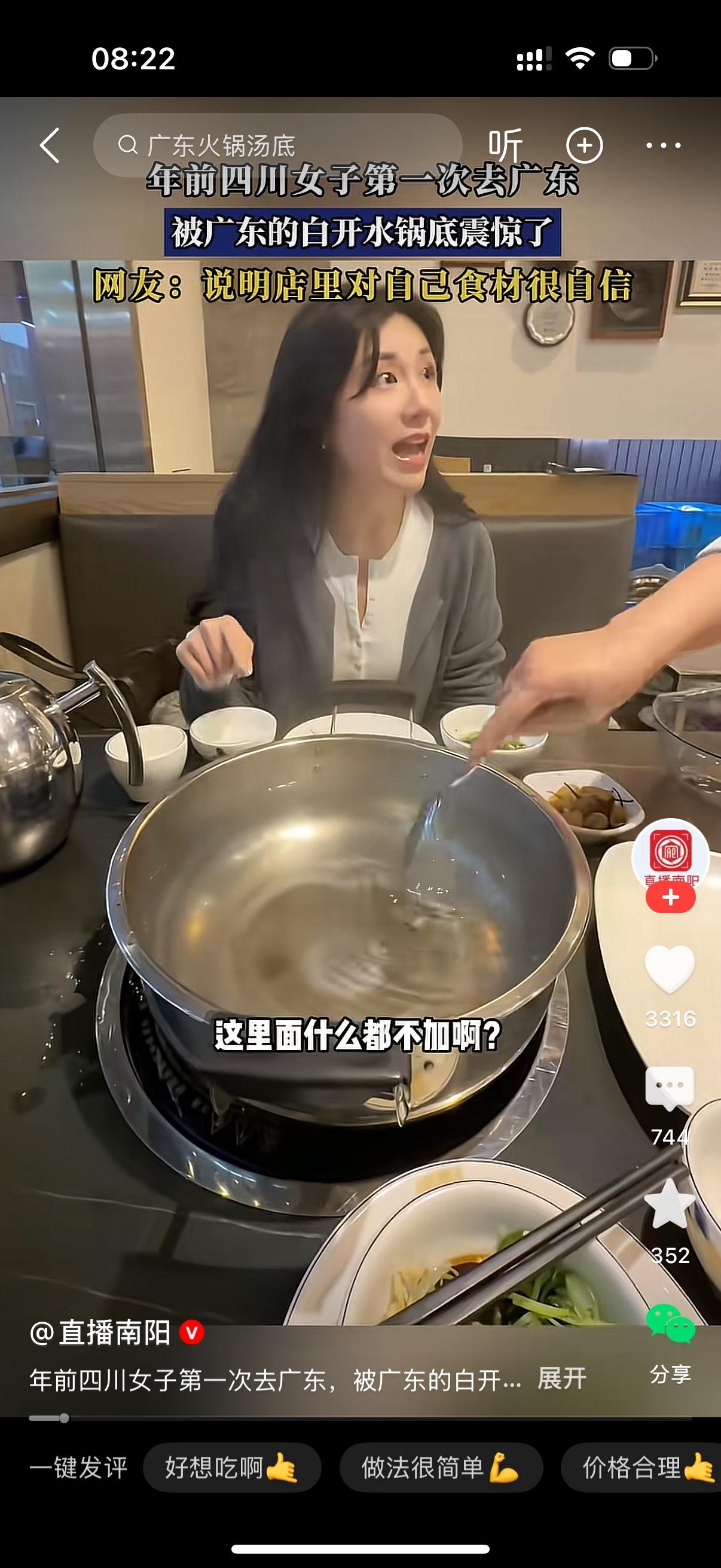四川女子第一次去广东吃火锅,看到锅底,她被震惊到了。看着一锅白开水,女子一脸懵逼的问,这里面什么都不加啊?服务员说是的,全部原汁原味。我们这边的食材全部是新鲜的。美女瞪大了眼睛,一副不相信的样子,我以为至少是个高汤,这个就是白开水烧?四川人永远不懂广东人的清淡。