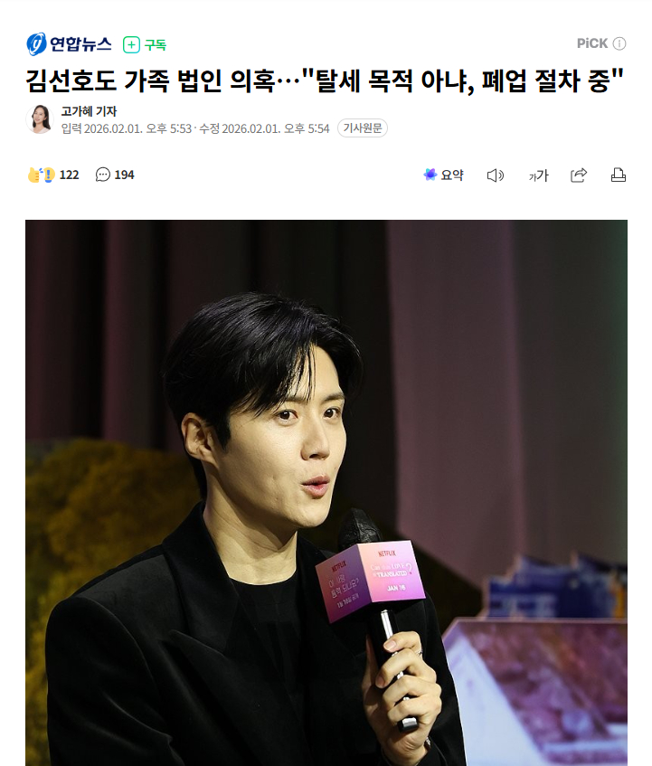 报道质疑金宣虎以其位于首尔龙山区住所的地址,设立了一家由家人担任高管的单独演出策划公司法人并运营,可能通过该法人迂回处理收入。