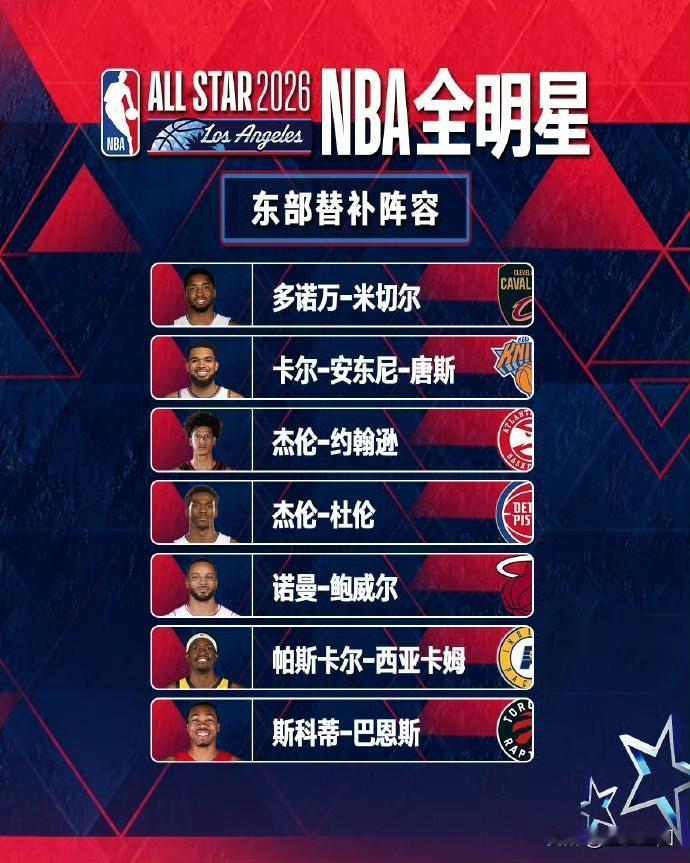 NBA2026年全明星替补阵容出炉! 西部:詹姆斯、杜兰特、华子、布克、切特、穆雷、阿夫迪亚。 老詹能入选一方面是特殊照顾,一方面也是他最近的表现确实可圈可点。切特能入选,是为了照顾联盟第一的雷霆。 作为东道主的快船,哈登和小卡都没能入选,多少有点不给面子了。小卡虽然出场少点,但最近状态很猛啊。哈登效率是低点,但整体表现给个名额也不过分吧? 东部:米切尔、唐斯、杰伦·约翰逊、杜伦、西卡、巴恩斯、鲍威尔。 东部这边倒是没啥太大争议,很平衡,前八瓜分一下名额。 NBA睿闻