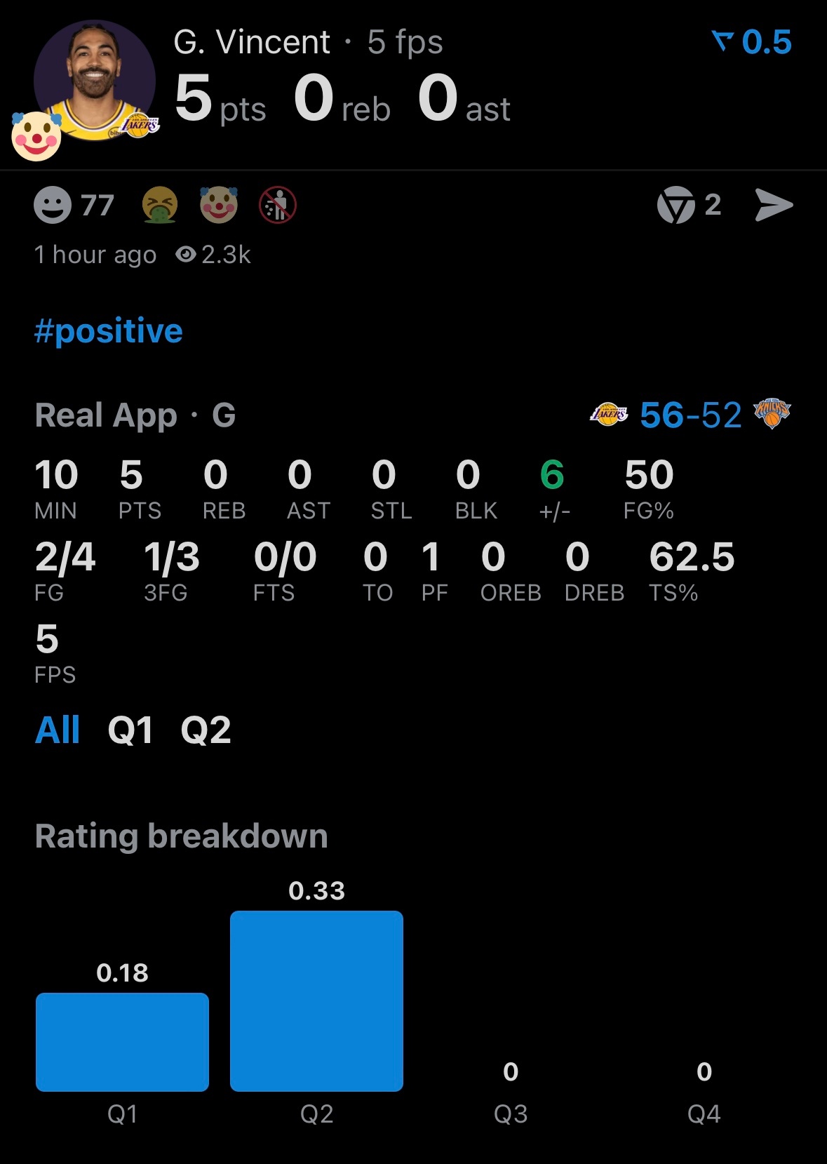 文森特半场5分,全场有望得到10分。打出交易价值,趁早远走高飞。湖人vs尼克斯