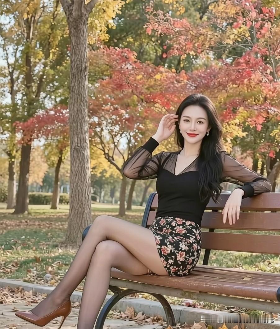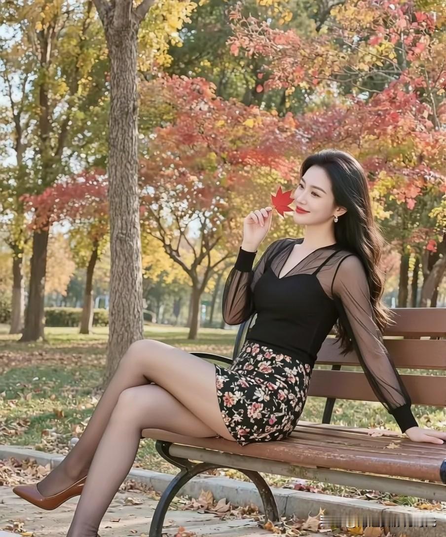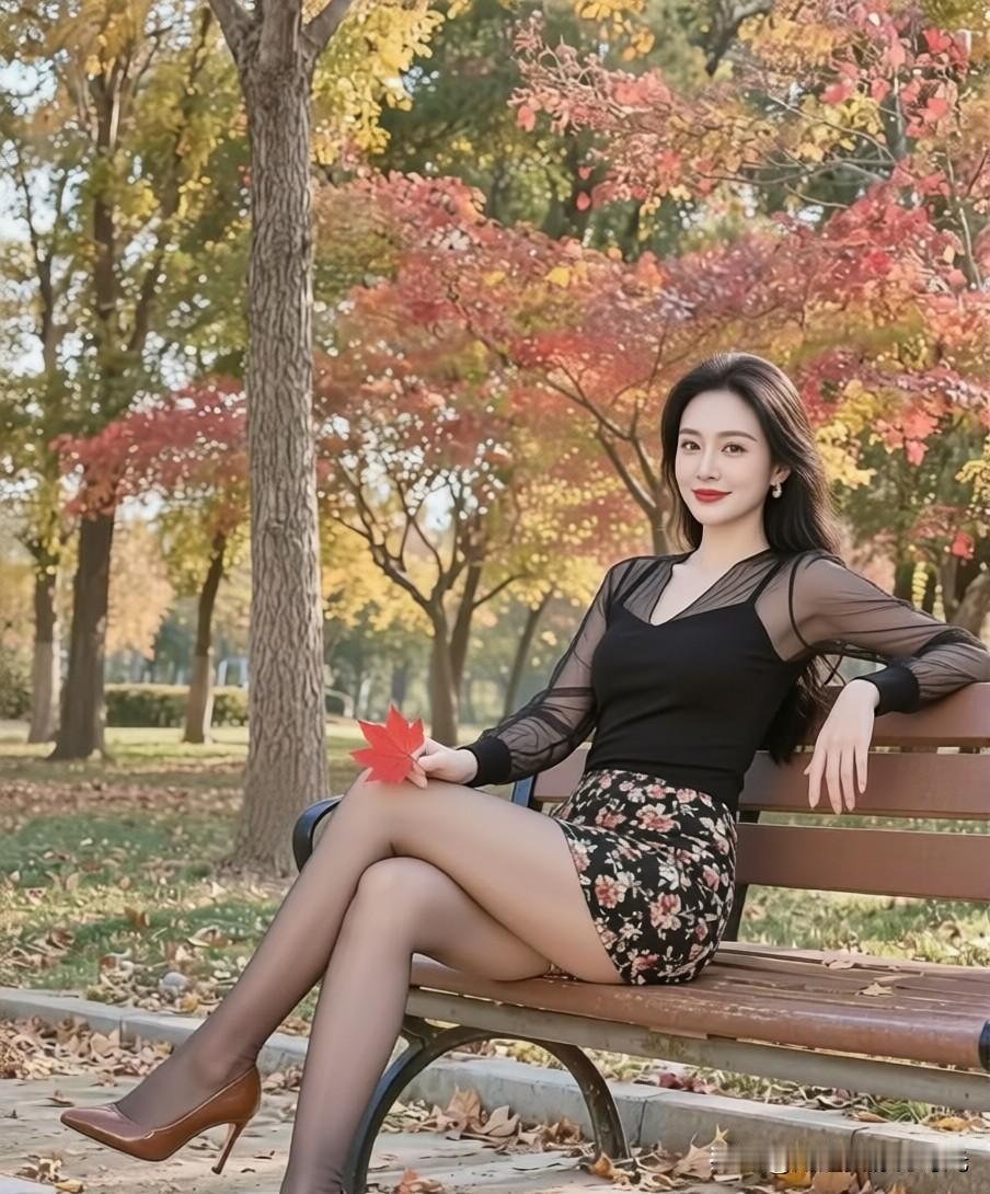 秋日暖阳下,红叶映衬下的优雅女子,静坐长椅,享受宁静时光。