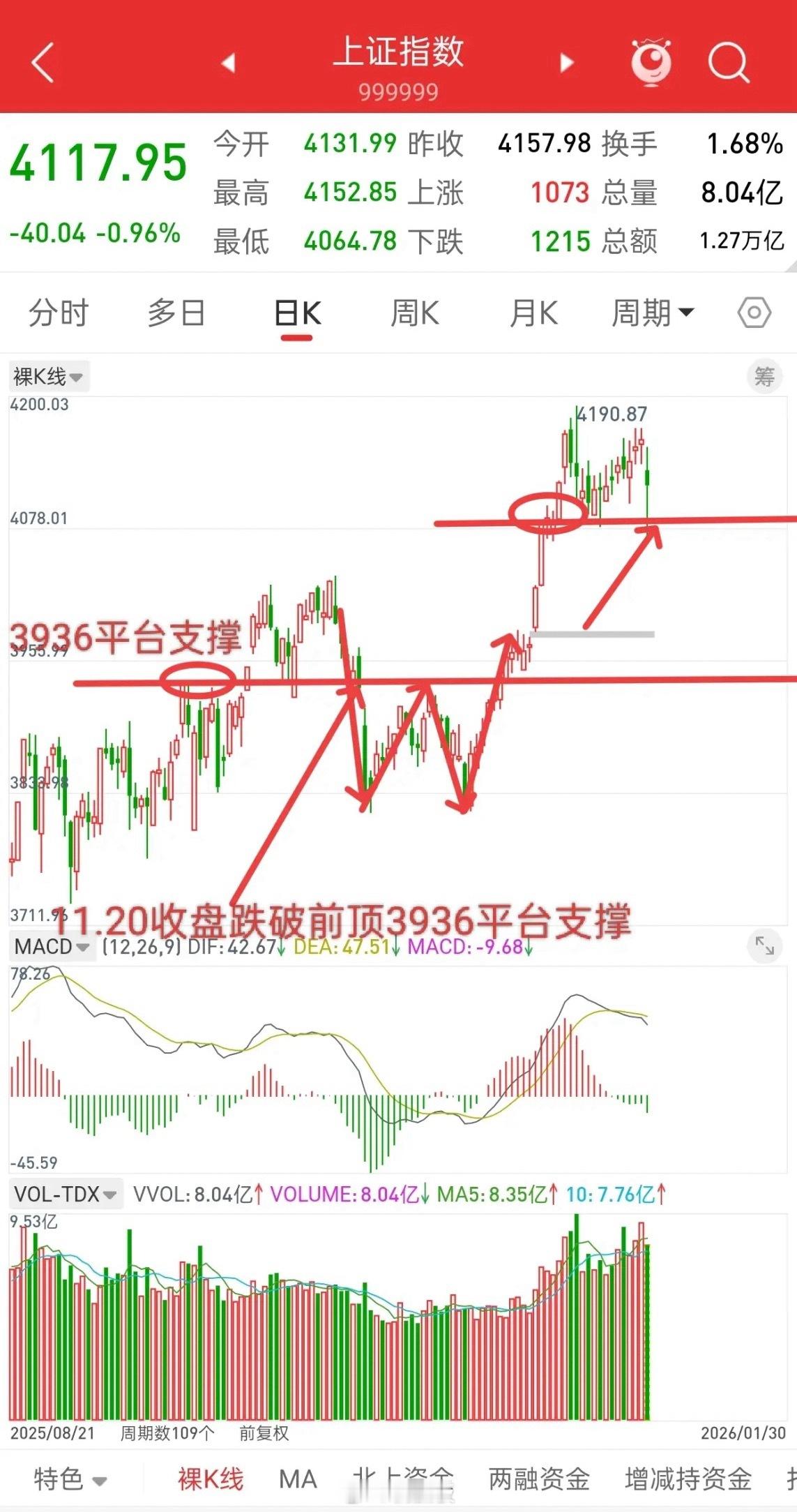 因为5-10-20周均线分别是4089,3998,3948左右。收盘价一旦跌破4080,说明前顶1.6号支撑无效,同时五周均线支撑也破了,因此需注意风险。
