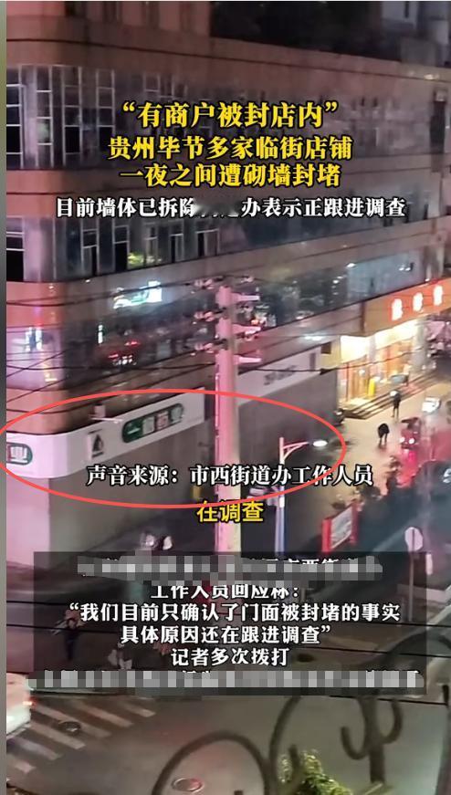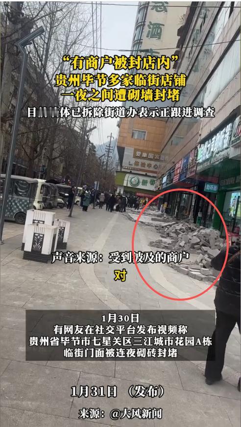 “严查到底!”近日,贵州毕节,一男子半夜到商铺备货,临走时竟发现商铺的门被堵死了,自己整整被困了一个晚上,被解救后才知道旁边十余间临街商铺都在昨晚被连夜砌砖封堵,十余户商户都被迫停业。网友:谁给的胆子? 春节临近,本是商铺生意最红火的时候,毕节的十余户临街商户却遭遇了一场无妄之灾。他们像往常一样关门回家,没想到一夜之间,店铺就被人用砖块从外面砌死,彻底封死了出路。 据媒体1月31日报道,其中一位商户凌晨想起店铺里还有重要货物,返回时发现店门已经被砖墙堵死,自己也被困在了店内。他拼命呼救,直到第二天才被人发现并报警。 等其他商户第二天一早赶来开店时,看到眼前的景象彻底懵了——崭新的砖墙堵在门口,卷闸门被完全封死,部分店铺的墙体甚至已经被拆除,店内的货物和设备都被困在里面。 有商户说,自己刚进了一批年货准备春节大卖,现在店门被封,不仅生意全毁,连货物都拿不出来,损失惨重。还有商户称,事发前没有收到任何通知,也没有接到相关部门的整改要求,这场连夜封堵完全是“突袭”。 目前,墙体也被拆除,当地相关部门已经介入调查,商户们正在焦急等待事件的原因和后续处理方案。 网友表示,这不是一间商铺,而是十间,希望赶紧彻查出来,给商户一个公道。也有网友提出质疑,封之前就没有通知吗?一夜之间砌墙封锁十余间商铺,动静这么大,就没人发现吗? 信息来源:《“有商户被封店内”贵州毕节多家临街店铺一夜之间遭砌墙封堵,目前墙体已拆除,街道办表示正跟进调查》中外观察