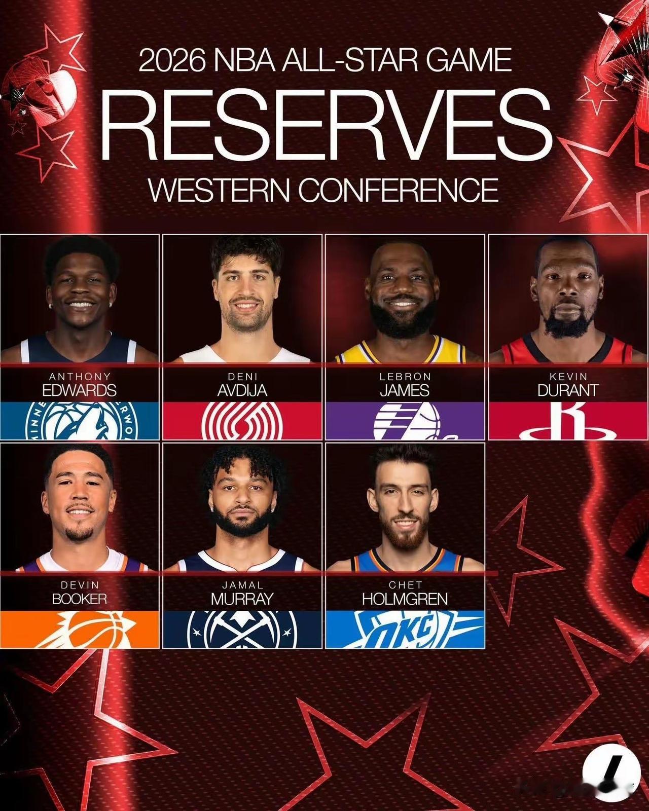 2026年的NBA全明星替补正式公布!![翻白眼] 东部:米切尔、唐斯、杰伦约翰逊、斯科蒂巴恩斯、鲍威尔、杰伦杜伦、西亚卡姆 西部:爱德华兹、贾马尔穆雷、杜兰特、詹姆斯、阿夫迪亚、布克、霍姆格伦 东道主快船居然没有一人入选全明星…[思考]