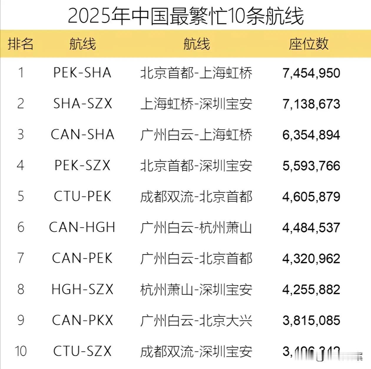 中部地区为啥很难打造超大型航空枢纽? 哪怕是九省通衢的武汉,也未能入选国际航空枢纽城市。 其实从地理位置就能看出来!中部地区“太中了”,铁路公路去四面八方都很方便。而航空运输,里程至少超过一千公里才有性价比。 所以,2025年全国最繁忙的航线,中部六省一个都没有,都是全国四个边角城市群之间的互动。机场数量排行榜