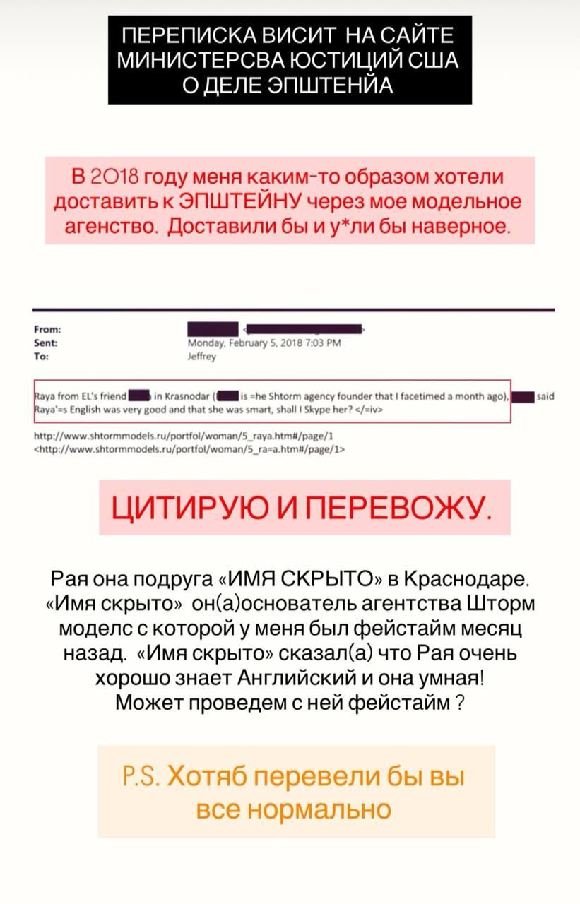 俄罗斯模特出现在爱泼斯坦文件中:但是她听父母的话没有去!一位名叫赖莎(Raisa)的俄罗斯前模特,来自克拉斯诺达尔,她的名字出现在爱泼斯坦的电子邮件中。现在她回忆说,她相信早在 2018 年,她的经纪公司就“为某件事做准备”。 她说当时曾有一位外国星探向她推销一份海外合同,是上一座岛屿参加什么开放式聚会,但她想了想拒绝了。“起初我以为这只是个愚蠢的玩笑……但想到我可能最终会沉入海底,真是太可怕了,”她写道。 “我父母劝我不要旅行。也许是巧合,也许不是。但我现在还活着,而且身体健康。上帝保佑了我。”