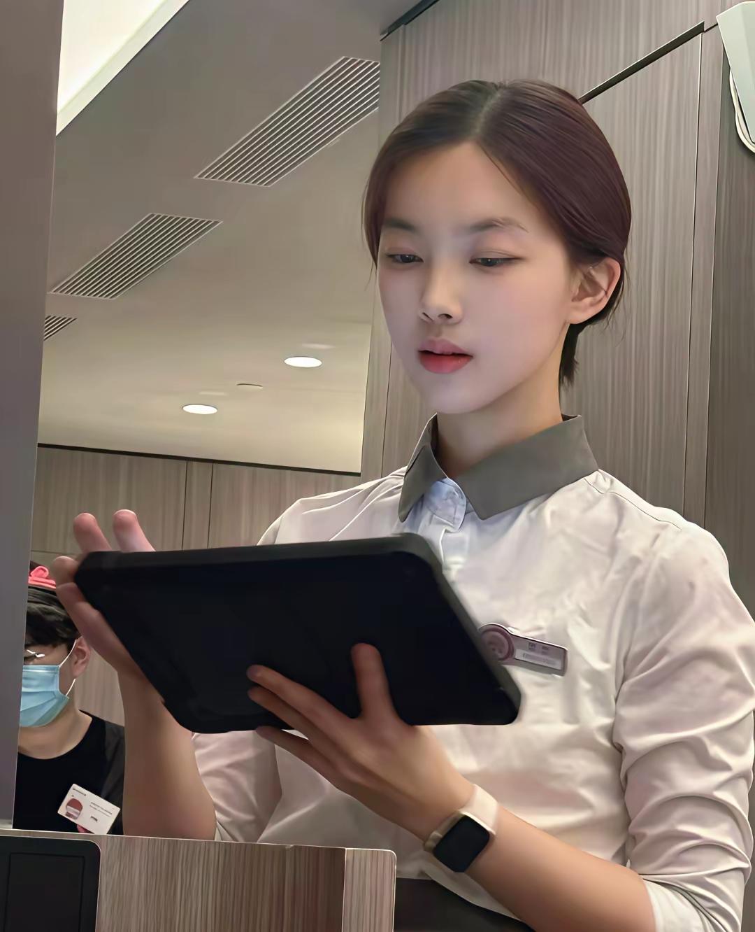 温柔又专注的样子真的很加分,利落的制服衬得气质清爽又干练,认真记录的模样让人忍不住多看几眼。