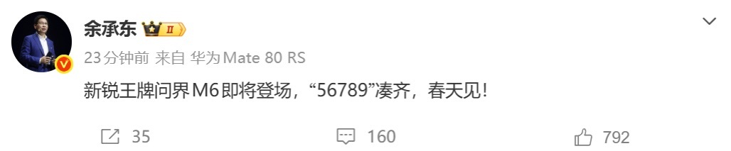 余承东说问界M6春天见终于等到余承东发文官宣,问界M6这匹新锐 “黑马” 真的要来了!从黑马视频到谍照细节,新车年轻化定位愈发清晰。作为家族矩阵的重磅新车,问界M6谍照里搭配21英寸大轮毂、超大卡钳和半隐藏式门把手,气场直逼保时捷Cayenne这些老牌选手,说是家族最帅车型毫不夸张!冰雪测试中动态表现超稳,底盘操控质感肉眼可见,旗舰同源配置大概率延续华为激光雷达、途灵平台和巨鲸电池技术,期待在辅助驾驶和性能方面能有惊喜。这么看价格肯定低不了,目测瞄准25-30万市场,结合家族累计交付超100万辆的口碑,看来这匹“黑马”要惊艳2026了。