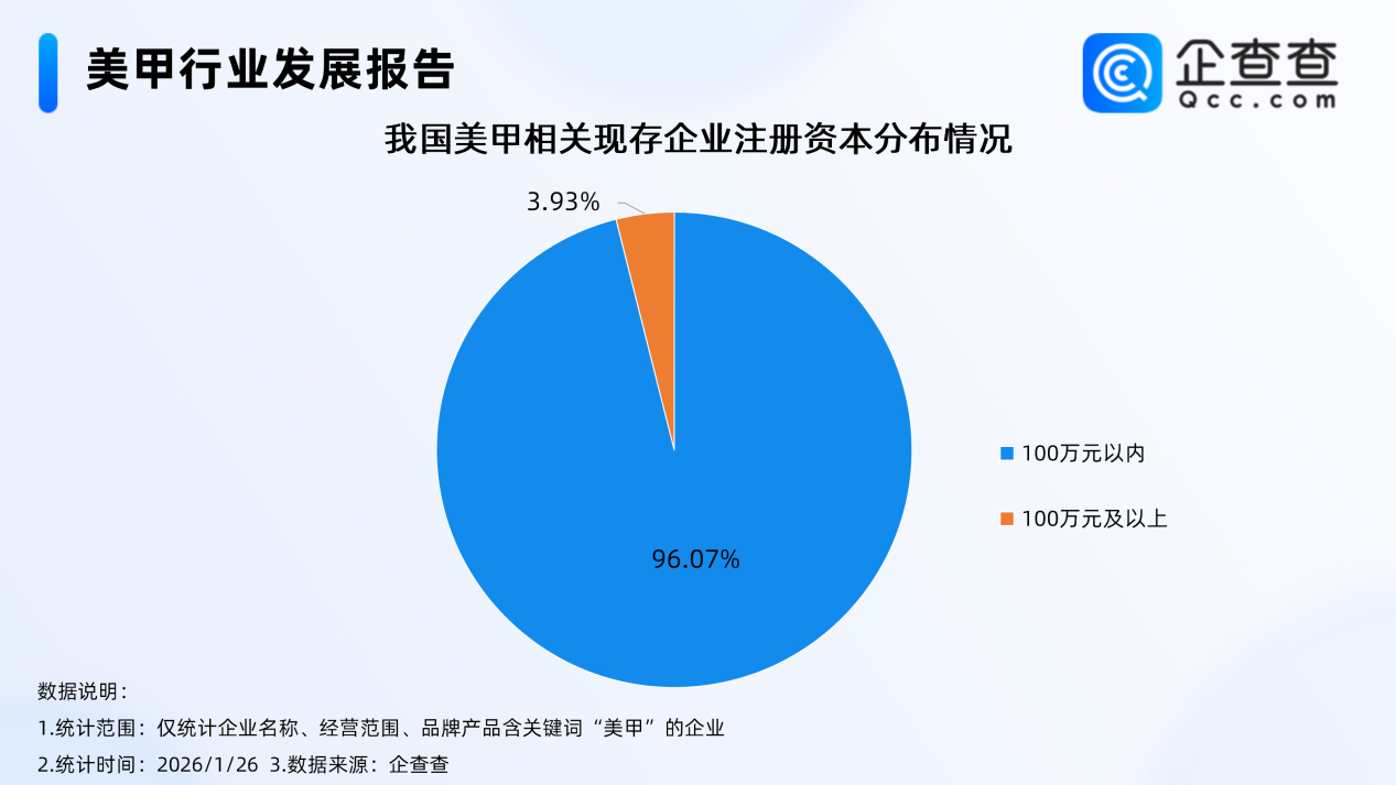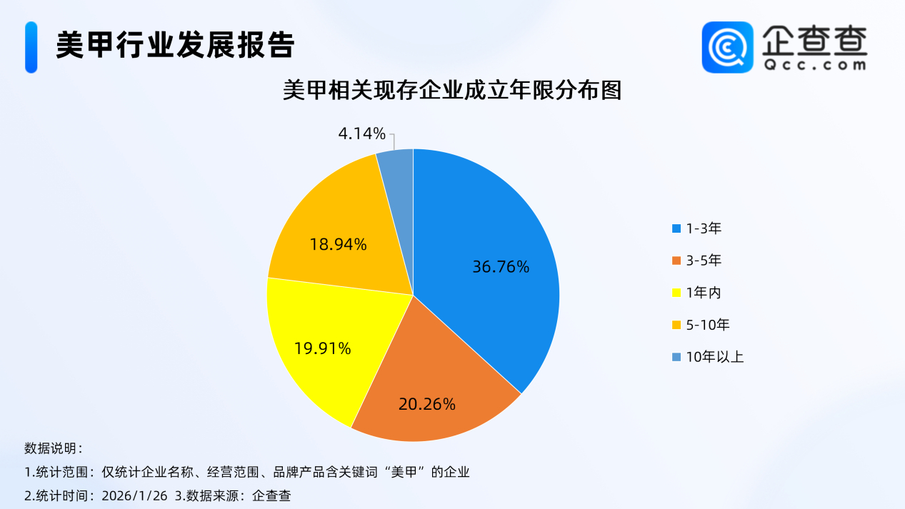 注册资本分布方面,国内现存美甲相关企业中,超9成相关企业注册资本在100万元以内;成立年限分布方面,近四成相关企业成立年限在1-3年,成立五年以上的相关企业占比达23.1%。注册量上,2025年注册量达34.59万家,超四成相关企业分布在三线、二线城市。