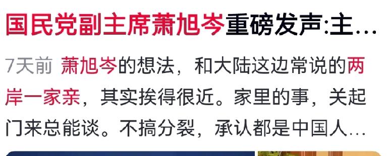 怎么看国民党副主席萧旭岑说:“两岸同胞是一家人”? 首先,台湾问题本质是解放战争的历史余绪,台湾是中国领土不可分割的一部分,这是国际社会广泛认可的共识。 其次,可是民进党当局却背道而驰。他们歪曲历史,借“中华民国”外壳行“台独”之实,表面沿用政治架构,暗地里不断掏空两岸同属一中的根基,还将台湾绑上外部势力的战车。他们一味抬高防务预算、大搞境外军购,却对民生难题视而不见;限制两岸交流、淡化文化认同,让亲情变得疏离。 第三,外部势力介入,让台海局势愈发紧张。美国等把台湾当棋子,根本不会为台湾兜底。萧旭岑提出的家人式协商,无疑戳中了民进党的软肋。事实上,两岸经贸往来密切、通婚现象普遍、文化寻根不断,民间交流从未中断。 第四,两岸的事,应由中国人自己说了算。谋“独”逆潮流、违民心,放下执念、拆掉隔阂、交流协商,台湾才能摆脱棋子命运,两岸同胞携手共赴民族复兴的伟大征程。 对此你怎么看?