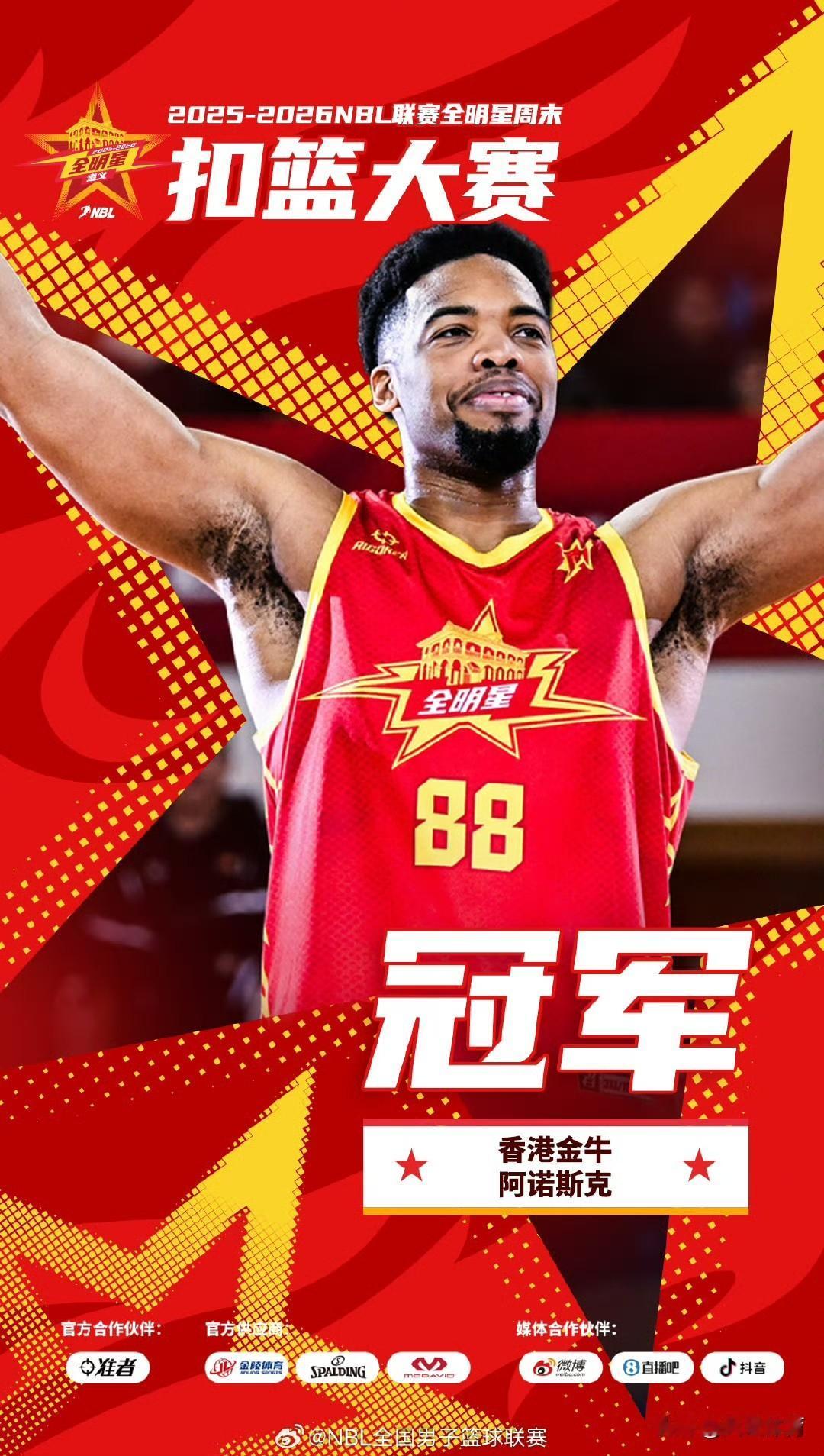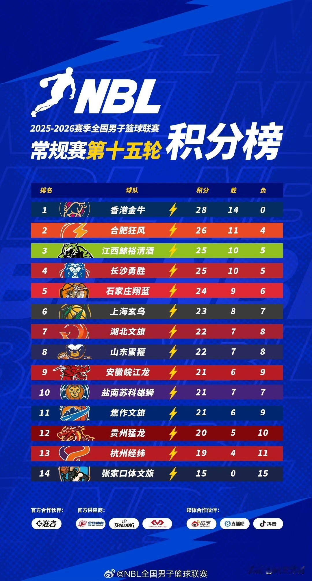 2026年NBL全明星赛落幕! 北京时间2月1日,NBL联赛全明星周末正赛历经四节比拼,最终南区明星队以126:111的比分获胜。来自江西鲸裕清酒的球员尼文·格洛弗表现出色,凭借37分7篮板7助攻的全面数据荣膺MVP。 单项赛中,东道主贵州猛龙的刘壮飞以26分斩获三分大赛冠军;技巧赛冠军由长沙勇胜的刘剑阁夺得。扣篮大赛冠军是香港金牛外援阿诺斯克,他cos敖丙的爸爸敖光并完成隔人暴扣,还大喊“我爱中国”,最终以第一轮46分、第二轮50分,总计96分的成绩夺冠。 截至目前,NBL常规赛第15轮比赛已全部结束。香港金牛在少赛一场的情况下,以14场全胜的战绩位居榜首,合肥狂风、江西赣驰以及长沙勇胜分别位列第2 - 4名。张家口体文旅至今仍未取得一场胜利。