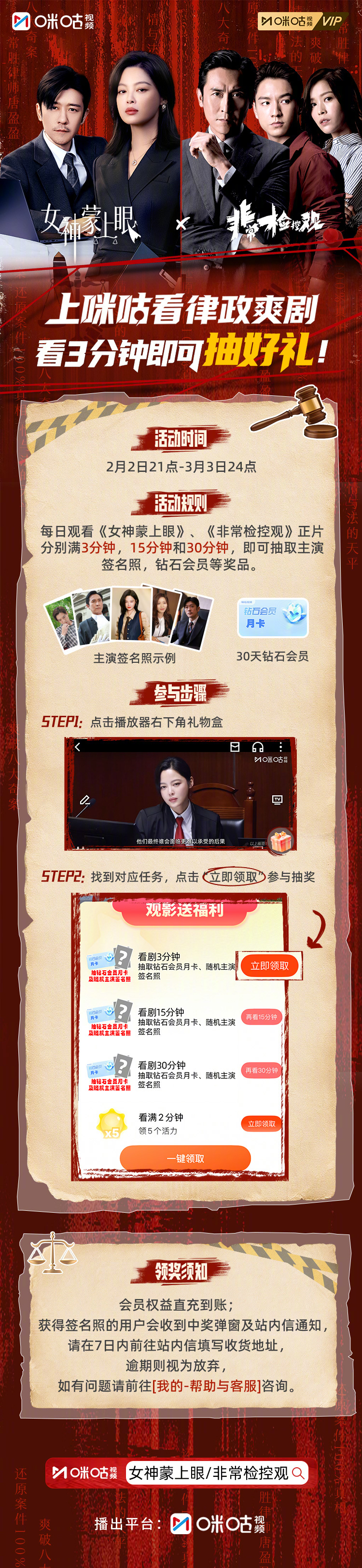 律政爽剧#女神蒙上眼##非常检控观# 追剧福利重磅升级!2月2日21点至3月3日24点,观看满3分钟即可参与抽奖✅ 随机主演等签名照等你来拿!✅ 咪咕视频钻石会员月卡,免费畅追好剧!详情见下方海报,一键点击追剧:网页链接