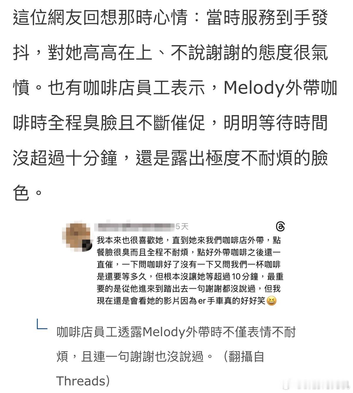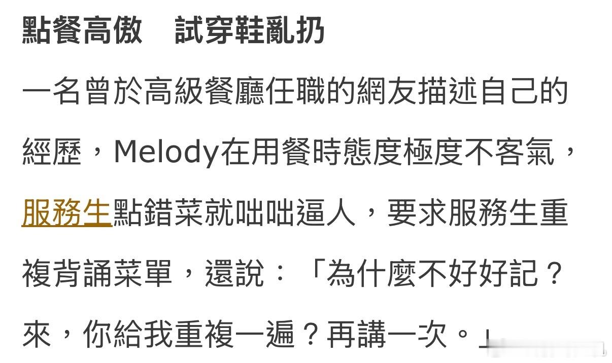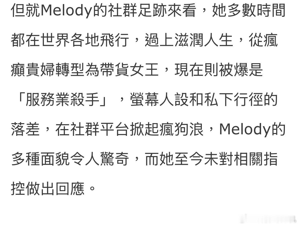 Melody最近在脆上被吐槽“服务业奥客”,目前她还没有做出回应。