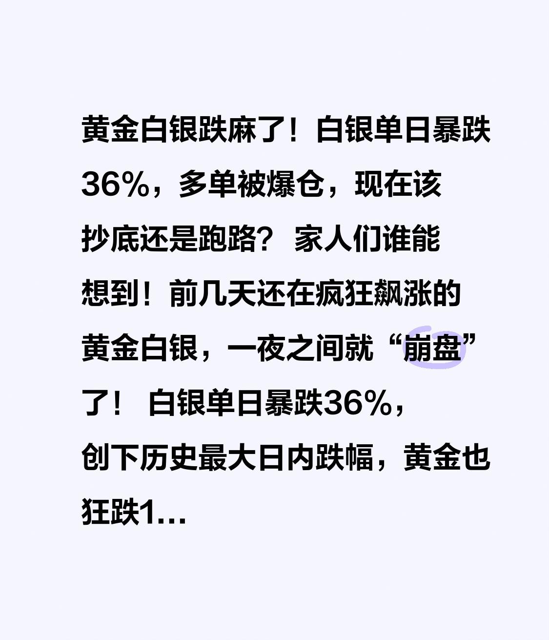 黄金白银跌麻了!白银单日暴跌36%,多单被爆仓,现在该抄底还是跑路? 家人们谁能想到!前几天还在疯狂飙涨的黄金白银,一夜之间就“崩盘”了! 白银单日暴跌36%,创下历史最大日内跌幅,黄金也狂跌12%,近40年最惨一天! 有人加杠杆追高,半天亏光半年工资;有人重仓抄底,结果抄在半山腰,账户直接被强制平仓——这场史诗级跳水,到底是谁在背后“收割”? 就在一周前,贵金属市场还是一片狂欢:黄金从4000美元涨到5600美元,月度涨幅超三成;白银更疯狂,从70美元飙到120美元,短短一个月暴涨60%。 朋友圈里全是晒盈利截图的,“闭眼买黄金都赚钱”的说法传遍全网,连菜市场大妈都在打听怎么开户买白银。 可谁能料到,1月30号晚上,一场“血洗”突然降临,多单散户集体被埋,哀嚎声刷屏投资群。 这场暴跌的“导火索”其实是一则消息:特朗普提名鹰派人物凯文·沃什出任美联储主席。 要知道,市场之前一直押注鸽派主席上台会继续降息,这才推着金银价格一路暴涨。 可鹰派主席意味着货币政策可能收紧,美元指数瞬间走强,以美元计价的金银直接被“釜底抽薪”,上演了“美元强、金银弱”的经典戏码。 但比消息面更致命的是杠杆资金的踩踏效应! 因为之前涨得太猛,很多人加了高杠杆进场,想着赚快钱。 而国内外交易所早就上调了保证金比例,资金压力本来就大。 价格一跌,大量止损单被触发,形成“平仓抛售→价格下跌→追加保证金→被动平仓”的恶性循环,程序化交易又放大了波动,白银因为市场体量小、流动性差,直接跌成了“重灾区”。 更扎心的是,很多普通投资者根本没搞懂就跟风进场。 有人把买房首付全砸进去买白银,结果一天亏掉20万;有人听“专家”说“金银长牛不回头”,满仓加杠杆,现在账户余额只剩零头。 他们不知道,白银被称为“贵金属中的易碎品”,日波幅能达到5%以上,高收益背后藏着能让人倾家荡产的风险。 不过大家也别慌,这场暴跌不是趋势反转,更像是上涨途中的“中场休息”。 从长期来看,全球央行还在疯狂购金,中国已经连续13个月增持,全球央行三年购金超1000吨; 美联储2026年整体降息趋势没变,地缘政治冲突也没解决,金银的长牛逻辑其实没破。 现在的下跌,更多是前期获利盘回吐和短期消息冲击导致的调整。 关键问题来了:现在该抄底还是跑路? 给大家三个实在建议,尤其是新手一定要记好: 第一,别加杠杆!贵金属波动太大,杠杆只会放大风险,新手坚决远离; 第二,控制仓位!黄金最多占可投资资产的10%,白银不能超过5%,用3-5年不用的闲钱投资; 第三,分批布局!黄金等回调到4200-4250美元再动手,白银等68-70美元区间再小仓位试水,别一次性满仓。 投资不是赌博,跟风追高永远是散户的噩梦。 之前黄金白银暴涨时,有人喊着“错过就没机会”,现在暴跌了,又有人慌着“割肉离场”。 但真正能赚钱的,永远是那些懂规则、控风险、不贪心的人。 贵金属长期看涨,但短期波动躲不开,只有敬畏市场、理性布局,才能在涨跌中不慌不乱。 如果你也在这场暴跌中亏了钱,或者正在纠结要不要抄底,欢迎在评论区说说你的经历和看法! 点赞转发,让更多人看到这个视频,避免再有人被市场“收割”! 记住:投资路上,活下来比赚快钱更重要!