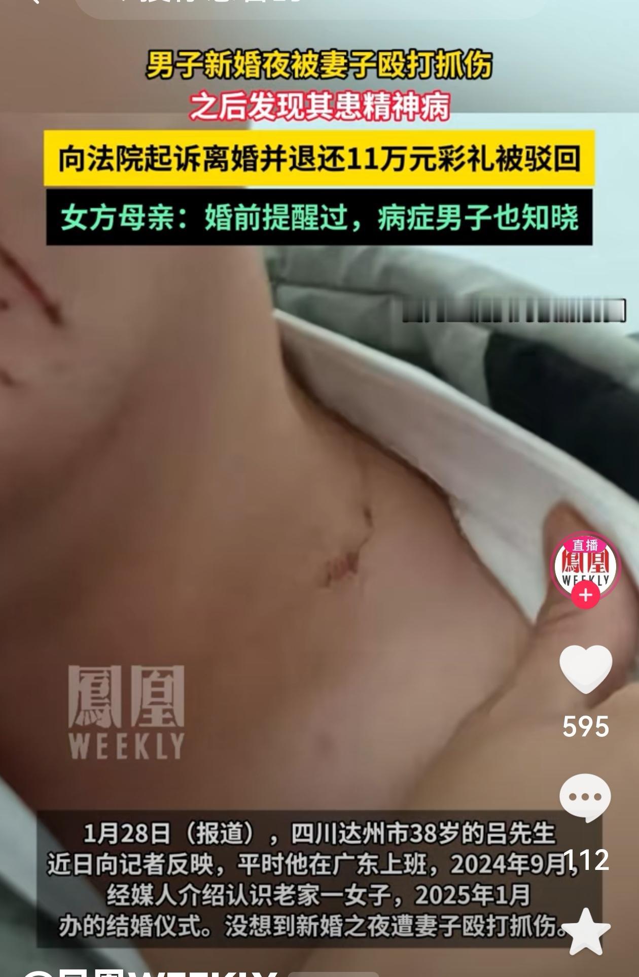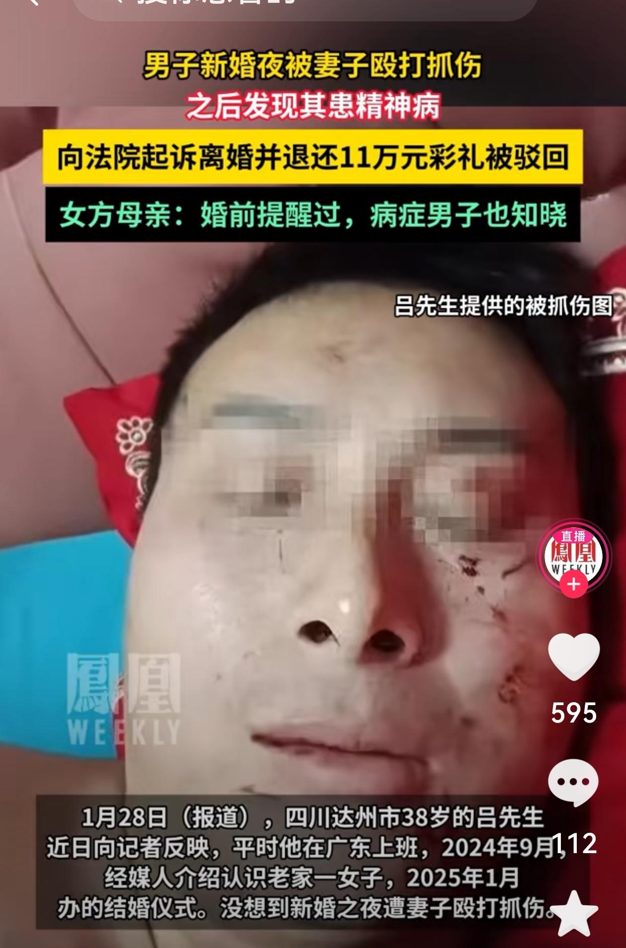 四川达州,洞房花烛夜,男子想与新婚妻子发生关系,结果被抓花脸。男子怀疑妻子另有新欢,而后见妻子辩称在生理期。可令男子万万没想到的是,妻子其实有精神分裂症。男子将妻子告上法庭,要求离婚并要求妻子退还11万余元彩礼。结果却被法院驳回! 吕先生在广东跑货运多年,38岁了才在老家的县城买了房装修好,一心想着安定下来成个家。 他在2024年9月,经媒人介绍认识了比自己小八岁的李巧,说是念过大学还当过老师,性格文静,长得也清秀,很符合他对妻子的想象。 两人刚开始接触不久就觉得还行,就这么定下来了。 两人通过微信聊了没几天,见了一次面就去重庆短途旅游了,然后吕先生把她带回广东小住了二十多天。 2025年1月,吕先生按照老家的规矩给出了总计十一万多的彩礼。 现金、祝神封红包、黄金首饰一样不少,有些钱甚至是信用卡刷的。 婚礼办得热热闹闹,四十桌请了亲戚朋友,一切看起来顺顺当当,可真正的麻烦从第一晚就开始了。 当晚宾客散尽,吕先生洗漱完准备进入新房,结果刚靠近妻子就被推开了。 李巧情绪突然失控,抓得他满脸是血。 吕先生一开始以为这是女人太害羞,或者心里还想着别人,于是小心翼翼问她是不是有别人,李巧低头不愿正面回答,还冷冰冰回了一句说你怎么还录音的,然后就躲被窝里不吭声了。 他脸上流血,心里着急,但看到她软弱的样子,他也没再闹,自己去了客厅睡沙发。 第二天回门看亲家,他怕令女方没面子,撒了个谎说是自己掉地上摔的。 女方家也没多说,只给了他两千块贴了些药费,算是糊弄过去了。 婚后没几天,他就又被抓了一次,这次是因为晚上拉扯被子,李巧又出手了。 两次被伤,吕先生其实已经察觉事情不对劲,可心想自己比对方大那么多,也不好随便把婚姻推翻,还是决定先回广东挣钱,给彼此一些空间。 在外跑车半年时间,他都试着维系这段关系。 5月20日还给李巧转了520元红包,买了鲜花,给她点点情绪关心。 可真正让他意识到问题严重,是10月份回老家拿衣服时发现的。 他打开卧室柜子,无意中翻出一盒贴着李巧名字的药,是利培酮片。 这药属于严格处方类的精神类药物,一般用于治疗精神分裂症。 那个药盒购药时间写的很清楚,是8月6日拿的,婚后半年。 吕先生心里一惊,把药盒翻来覆去看了几遍,脑子一片空白,瞬间联想到之前她的抓伤行为和平时反常安静的状态。 他把这些事全都联系起来,突然明白过来,可能这个女人从一开始就没把一件重要的事告诉自己。 他找李巧对质,对方还是沉默,说你也没问过。 两人协议不成,李巧坚决不同意离婚,吕先生拿着利培酮药盒、自己拍的抓伤视频,还有彩礼清单和结婚照片,决意走上法院这条路。 11月,他拿卖车的钱请了律师,正式向宣汉县法院起诉。 他指控李巧婚前隐瞒重大疾病,婚后暴力行为不断,完全没有夫妻生活,要求判离并要求返还全部彩礼。 可法庭上,李巧突然拿出了一份证据,说吕先生在520那天给她转账、还送花,说明两人感情并没破裂。 吕先生当庭解释这只是为了缓和关系,不代表真心和好。 法院围绕这笔转账做了大量询问,最终裁定两人感情未完全破裂,不予判离,原告其他请求也不支持。 也就是说,不仅没离成婚,吕先生还得继续承担那11万多块的债务。 不少人看完判决后为吕先生鸣不平,网上也开始争论起这个判罚到底合不合理。 其实仔细研究民法典,吕先生本来可以走另一条路。 按第1053条规定,如果配偶在婚前患有重大疾病,没有如实告知,在另一方知情后的一年内可以请求法院撤销婚姻。 而撤销和离婚完全不是一回事。 撤销是指这桩婚事从一开始就不成立,这样不仅能解除婚姻关系,也更有利于彩礼返还。 吕先生错就错在走的是离婚程序,而法院判离的标准是感情破裂。 感情破裂要举证双方长期分居、互不履行义务、甚至无法共同生活之类。 法院看他520还发了红包,觉得这不是破裂,于是整场诉讼败了个干净。 现实面前不是每个普通人都能选对路径,也不是每个终点都有公平结果。 有不少人关注这个案子的判决,一边感叹彩礼风气难改,一边争议法院的标准是否失之片面。 你怎么看?欢迎在评论区聊聊你的观点。