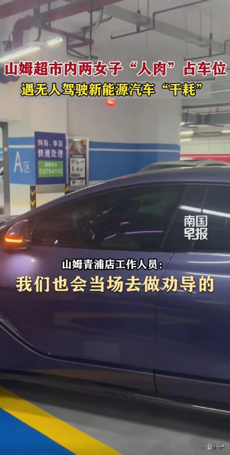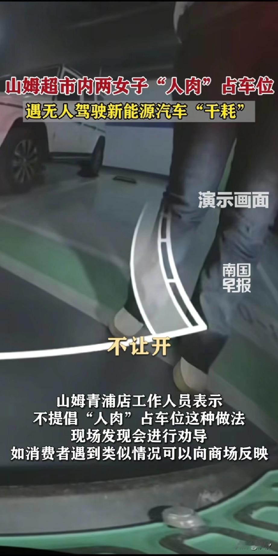 如果遇到人肉占车位,你会怎么办? 新能源电动汽车已经给出了答案, 那就是给他干耗着, 山姆青浦店车库遭遇了人肉战车, 新能源车辆检测到有车位, 于是就走,倒车入库, 结果女的不但不怕, 反而靠近车辆, 敢于用自己的身体和新能源汽车硬撞, 车辆毕竟是机器, 一旦探测器发生故障, 真的压过去发生车祸, 那女的必然是全责, 现在的新能源车辆都会自动泊车, 遇到这种人肉战车的就和他干耗着, 女的也不嫌弃尴尬, 保安发现后立刻上前劝导, 但是两个女子坚决不让, 就非要占着这个车位, 后面堵了非常多的车, 大家一直都在安喇叭, 整整过去了五分钟, 最后没办法只能把车位给了这个女的, 这更加住长了女人嚣长了气焰, 估计以后她还会这么做! 大家觉得用人肉占车位这事好吗?