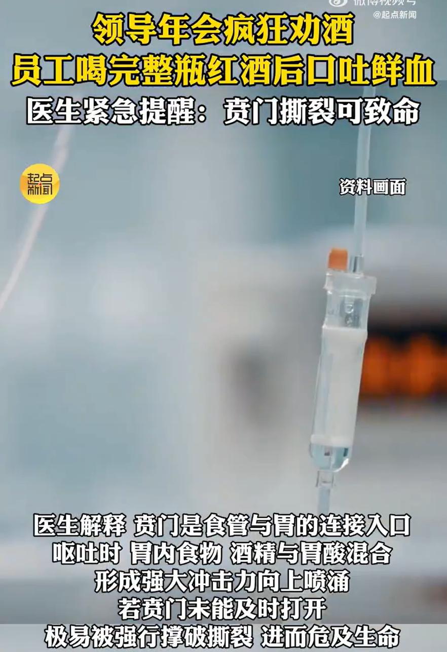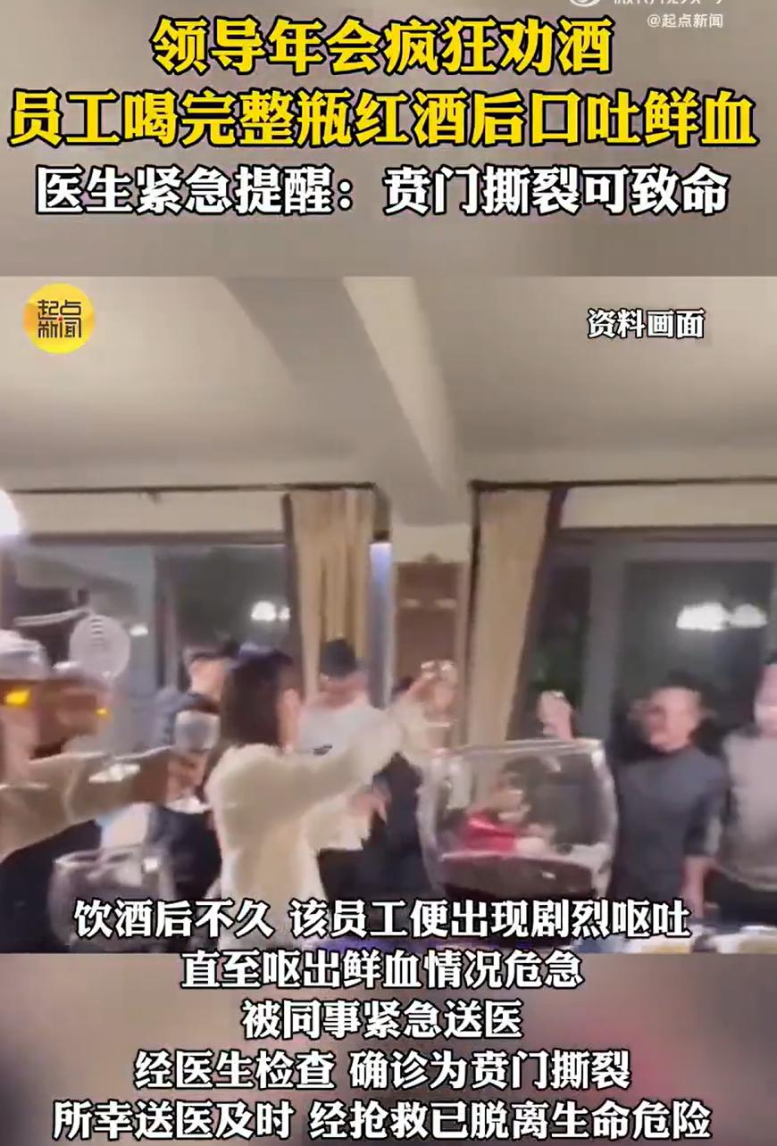这下领导摊事了!浙江宁波,一男子去参加年会,在酒桌上被领导疯狂劝酒,虽然平时不喝酒,但想到自己是公司新人,也不好折了领导和同事的面子,就一杯杯的喝了起来,结果喝完口吐鲜血,送以后被确诊贲门撕裂,好在抢救及时才救了过来 当天,饭局气氛渐热,领导端着酒杯过来,拍了拍他肩膀,说小伙子表现不错,这杯得干了。旁边的老同事也跟着起哄,说年底就该放松,不喝可不行 一桌人的目光都聚在他身上,有笑意,也有某种无形的压力。他脸涨得通红,几次摆手,话到嘴边又咽了回去,毕竟自己是新人,驳了领导面子,以后还怎么混?想着咬牙撑过去,便接过杯子,一口闷了下去 这一开头,就刹不住了。领导夸他爽快,同事轮番来碰杯,红的白的混着来。他只觉得从嗓子到胃里一路烧下去,头晕目眩,但还得强撑着赔笑脸。最后硬生生灌下差不多一整瓶红酒 散席时,他已经站不稳了,被同事搀着往外走。刚到门口,一阵剧烈的恶心感猛地袭来,他冲到路边弯腰呕吐,起初是食物残渣,接着是暗红色的液体,最后竟是一口鲜红的血。周围人吓坏了,有人尖叫,有人打120,场面乱作一团 送到医院急诊,检查结果很快出来:贲门黏膜撕裂 医生解释,就是胃和食管连接处那个很脆弱的位置,因为短时间内剧烈呕吐,压力太大,被硬生生扯撕裂了,导致急性上消化道出血。再晚点,后果不堪设想。经过紧急内镜止血和抢救,他才慢慢脱离危险 好好一场年会,差点成了悲剧现场。躺在病床上的是员工,但真正该冒冷汗的,恐怕是当时在酒桌上那些热情劝酒的人,尤其是那位领导 从法律上看,事情更不简单。如果劝酒行为被认定为强迫,或明知对方不能喝仍极力劝饮,最终导致人身损害,劝酒者是要承担相应法律责任的。这不是简单的道德问题 其实,职场里真正牢固的关系,从来不是喝出来的。一个靠谱的领导,应该懂得尊重下属的身体和意愿,一杯茶、一句关怀,比任何烈酒都暖人心。一个健康的团队,也应该允许成员坦然地说“我不能喝”,而不必担心被排斥。工作最终看的是能力和人品,不是谁的酒杯端得更低