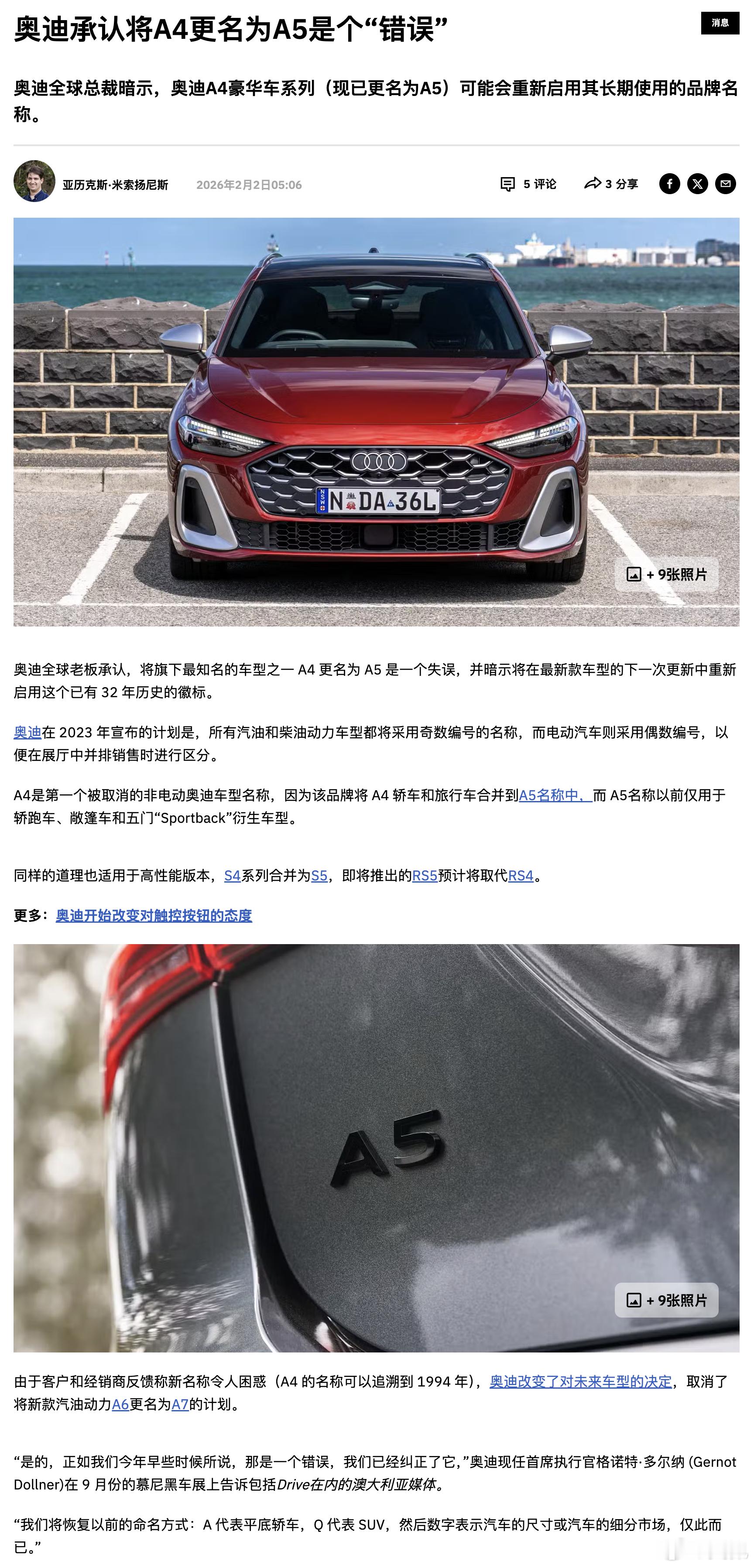 要改回叫A4了,听着就顺很多!你喜欢它改名A5,还是称A4?奥迪承认A4更名A5是错误