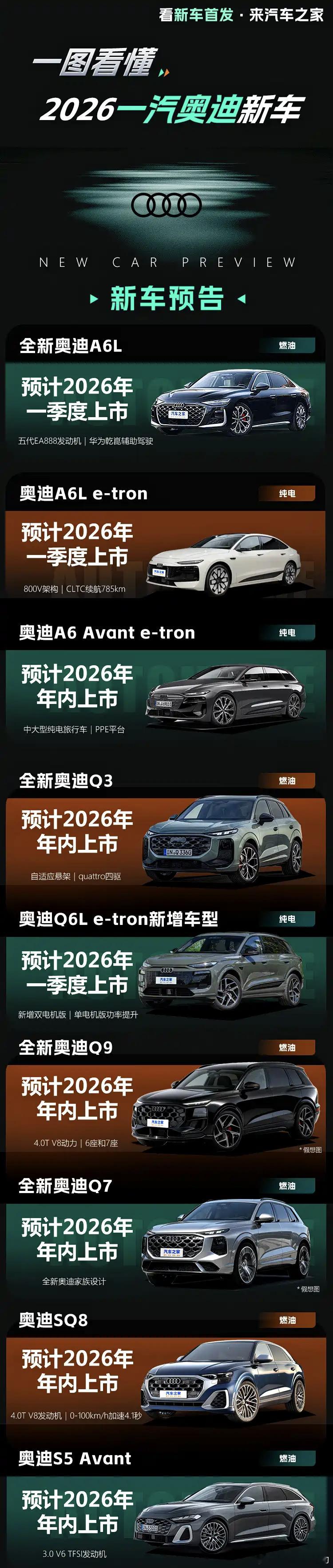 2026一汽奥迪新车总览 燃油纯电双线发力,A6L家族、Q系列齐焕新!