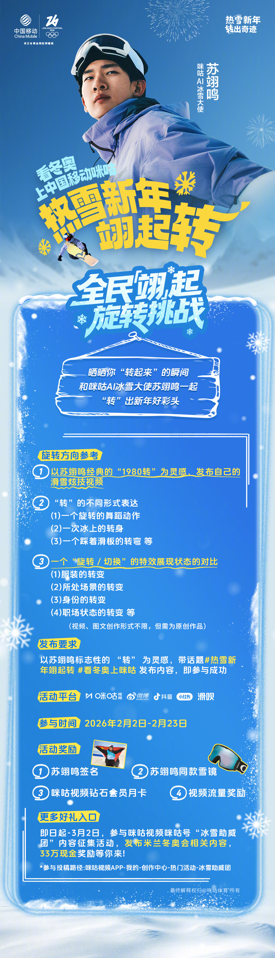 #热雪新年翊起转# 米兰冬奥倒计时,和咪咕AI冰雪大使携手打造线上“热雪新年翊起转”挑战赛,无专业要求、不限创作形式,2月2-23日,五大平台同步开启,快来转出你的专属花样,赢惊喜奖品!#看冬奥上咪咕#