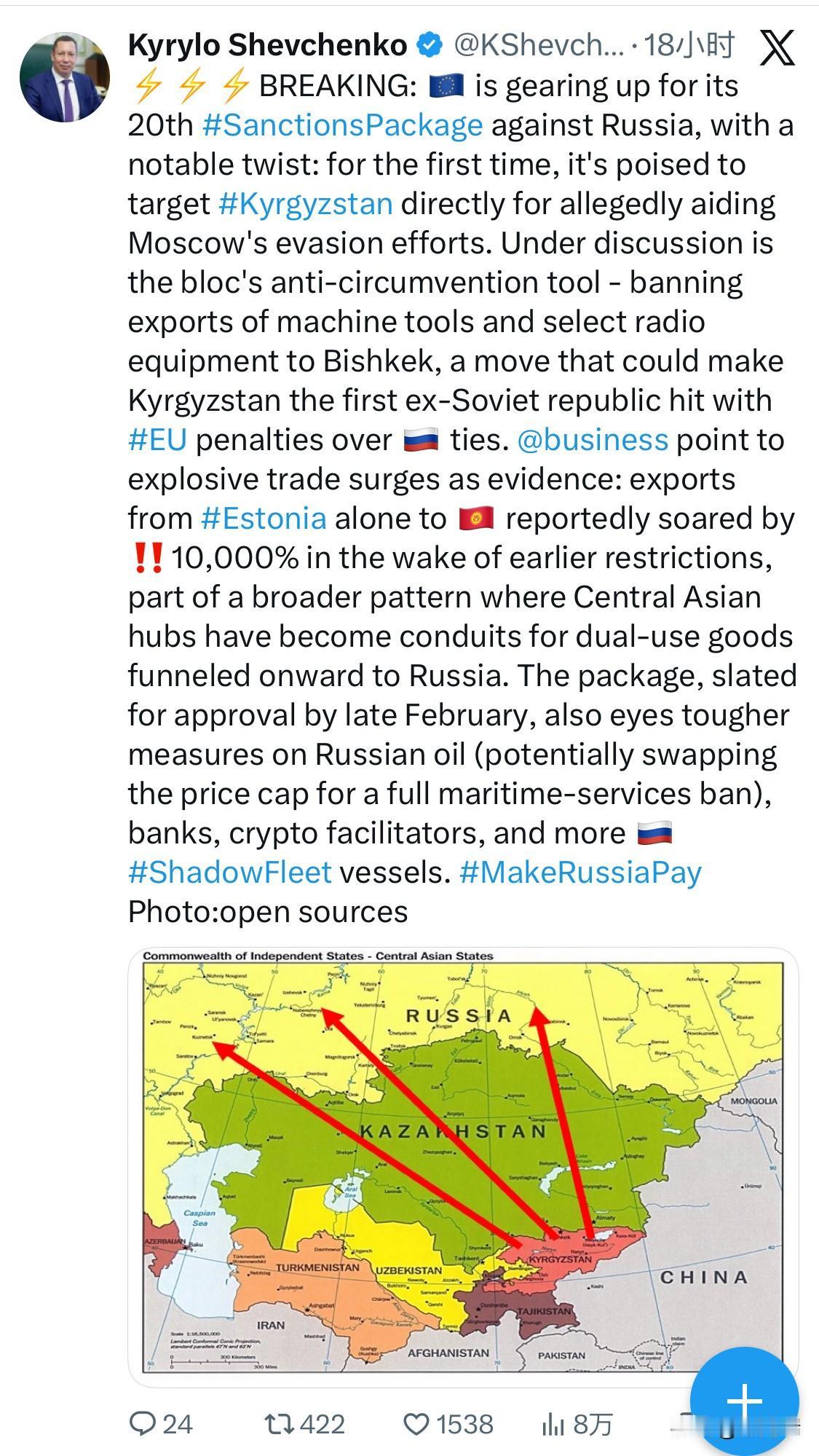 欧盟目前正计划于 2026 年 2 月 24 日(即俄乌冲突四周年之际)通过针对俄罗斯的第 20 轮制裁方案。 这一轮制裁的显著变化在于,欧盟正考虑首次启动“反规避机制”,直接针对吉尔吉斯斯坦实施限制。 自 2022 年以来,欧盟多国对吉尔吉斯斯坦的出口额出现了惊人的增长。例如,爱沙尼亚的出口增长了 10,000%,芬兰增长了 3,100%,波兰、希腊、德国和捷克也均有大幅增长。 充当“中转站”:分析人士认为,吉尔吉斯斯坦已成为欧洲受制裁商品(特别是两用物项和高科技设备)进入俄罗斯的主要“平行出口”枢纽。 针对吉尔吉斯斯坦的具体措施 出口禁令:欧盟拟利用专门的惩罚机制,禁止向吉尔吉斯斯坦出口特定敏感货物,目前重点讨论的是机床和无线电电子设备。 金融打击:此前的第 19 轮制裁已涉及两家吉尔吉斯银行(Tolubay Bank 和 Eurasian Savings Bank),第 20 轮预计将进一步扩大对协助俄罗斯规避制裁的第三方国家金融机构的限制。 第 20 轮制裁方案的其他重点 打击“影子舰队”:计划针对近 900 艘用于运输俄罗斯石油、逃避价格上限的“影子舰队”油轮,可能实施全面的海事服务禁令。 能源与大宗商品:进一步收紧对俄罗斯液化天然气(LNG)、金属和化肥的进口限制。 扩展清单:增加更多涉及规避制裁、军事生产以及非法转移乌克兰儿童的个人和实体进入黑名单。 目前,该方案仍处于成员国讨论阶段,需获得全票通过后方可正式实施。