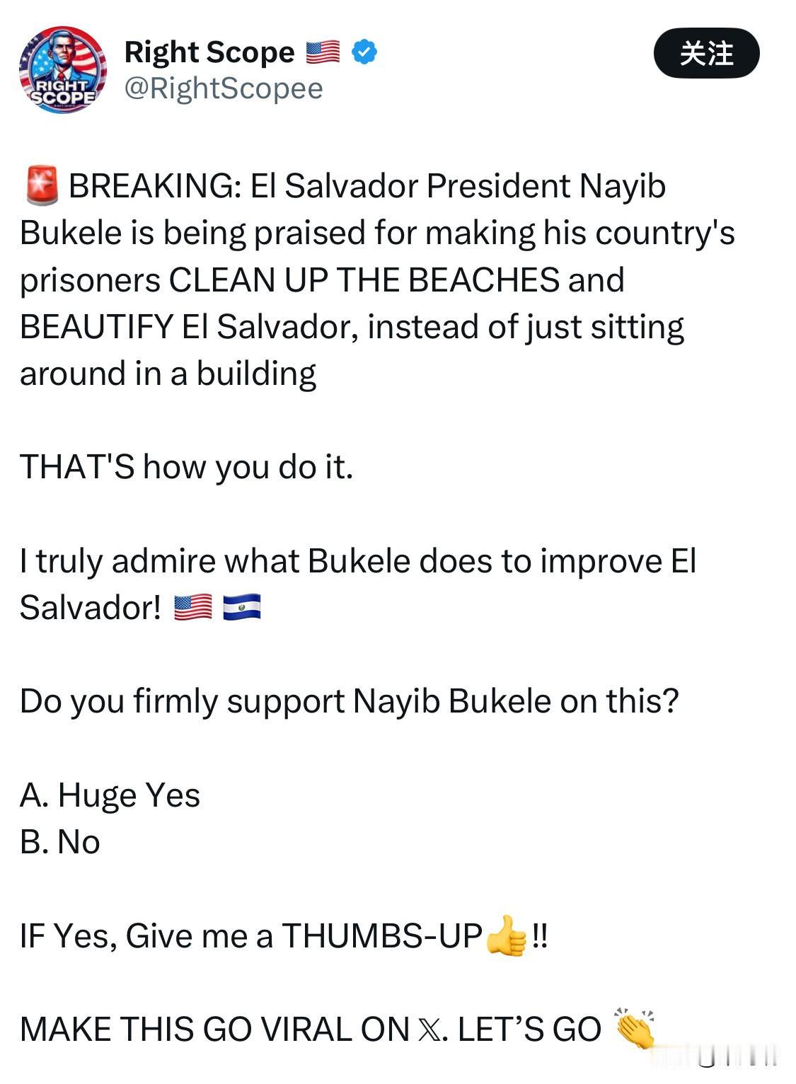 萨尔瓦多总统纳伊布·布克莱(Nayib Bukele)通过其政府推行的“零闲置计划”(Plan Cero Ocio),正让大量非危险性囚犯参与清理海滩、修缮公共设施和美化环境等社会服务,这一举措在近期再次引发了国际关注与广泛讨论。 囚犯被派往包括 La Costa del Sol 在内的多处旅游海滩进行清理作业。他们穿着醒目的黄色工作服,负责清除垃圾、修剪植被,并参与修建学校和维护社区基础设施。 社会融入与减刑:该计划目前涵盖约 2,000 名 被归类为“信任阶段”的囚犯。参与者多为非暴力罪犯或被证实受帮派威胁而被迫合作的人员,他们通过劳动偿还对社会的“债务”,并有机会借此减少刑期。 国际反响:这些劳动画面在社交媒体上广泛流传,许多支持者赞扬这种让囚犯自食其力、为国家做贡献的模式。然而,人权组织如人权观察 (Human Rights Watch)则表达了担忧,认为该国在“例外状态”下存在大量任意拘留,且监狱内部环境恶劣。 延伸背景 狱政改革外包:布克莱近期还提出了一项备受争议的建议,即愿意接收从美国驱逐的帮派成员甚至美国籍囚犯,将其关押在萨尔瓦多的巨型监狱(CECOT)中,并利用类似的劳动计划使监狱系统实现财务自给自足。 地区影响:萨尔瓦多的这种严厉治罪与劳动改造相结合的模式,已引起邻国如哥斯达黎加的效仿意向。哥斯达黎加总统查韦斯近期曾参观萨尔瓦多监狱,探讨引进类似的安保和狱政政策。