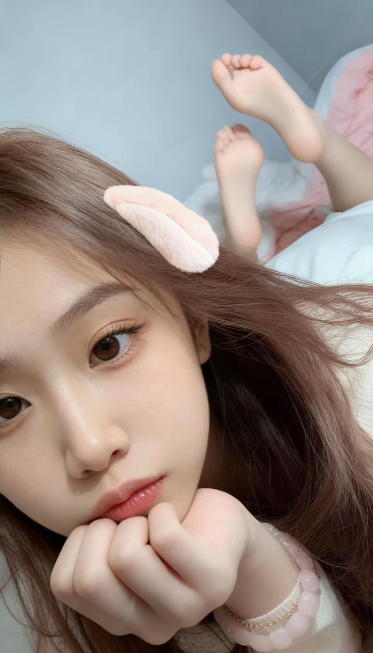粉粉的兔耳发夹别在蓬松的棕发上,软乎乎的小手托着腮,连脚丫都跟着慵懒翘起,是窝在被窝里不想动的可爱小迷糊呀。