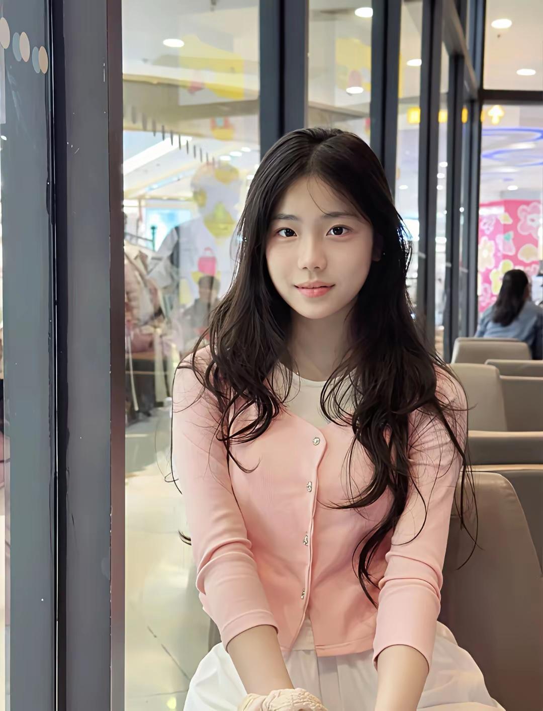 粉粉嫩嫩的针织开衫衬得笑容更甜,蓬松的卷发像裹着一层温柔的滤镜。在商场落地窗边的小憩时光,连空气都跟着变得软乎乎的。