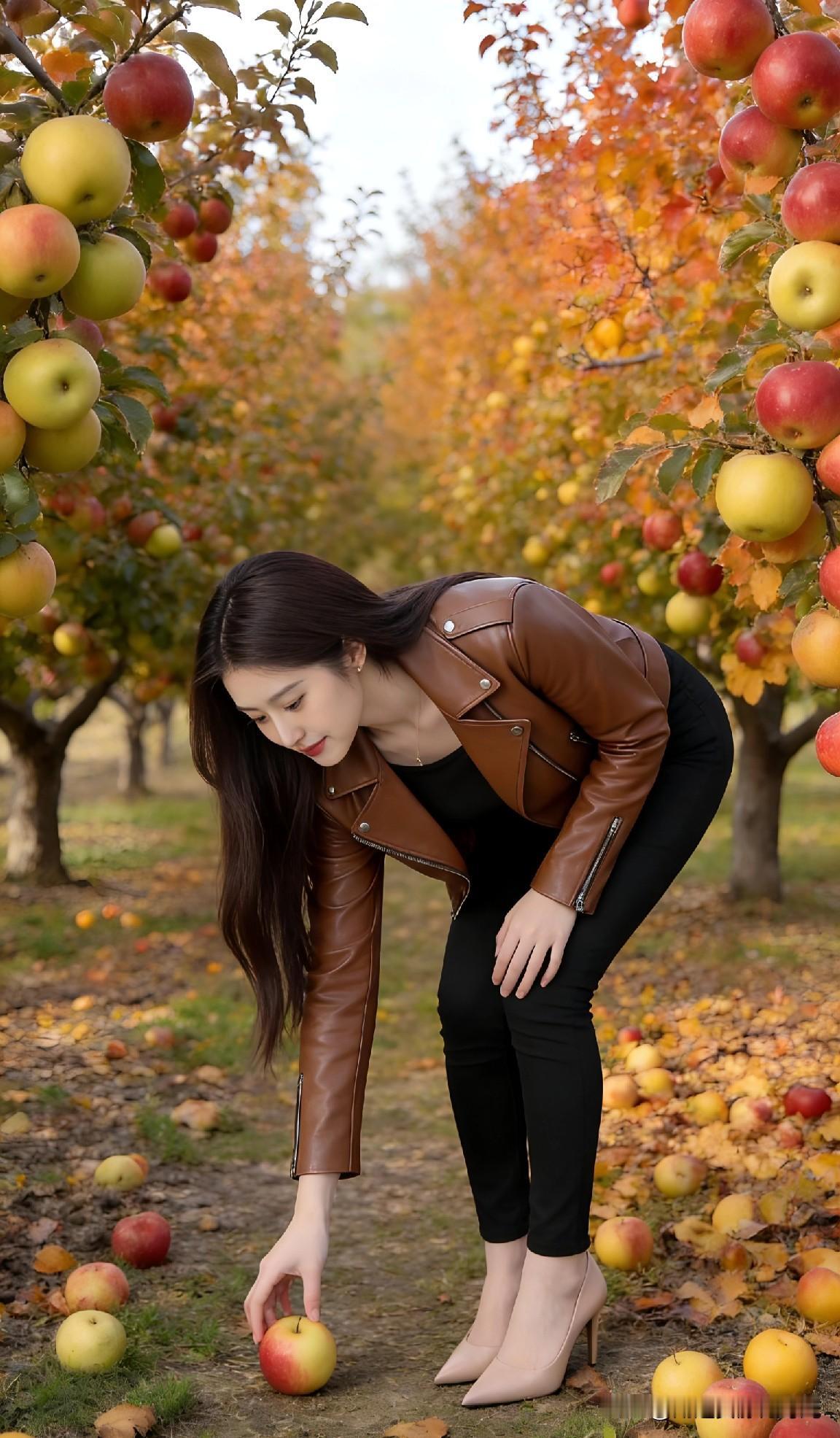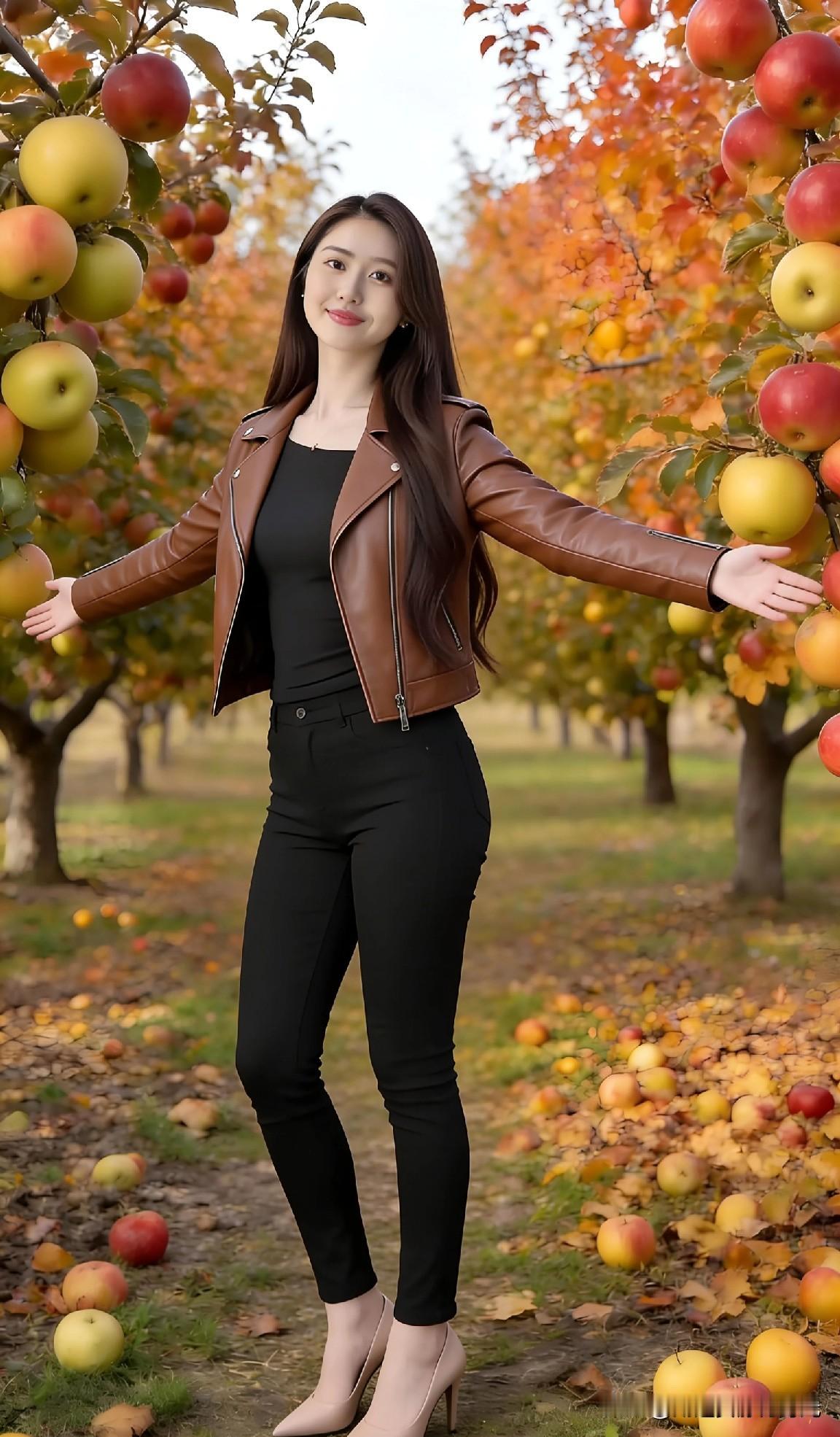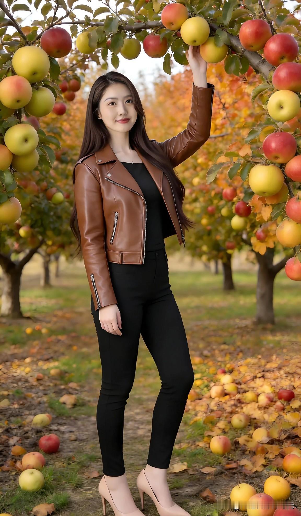 秋日果园里的时尚少女,红苹满树,甜美动人