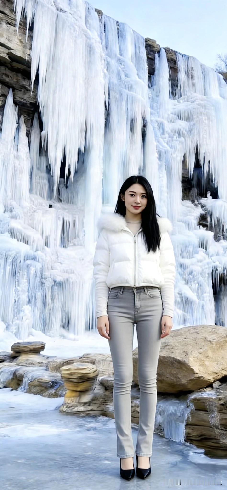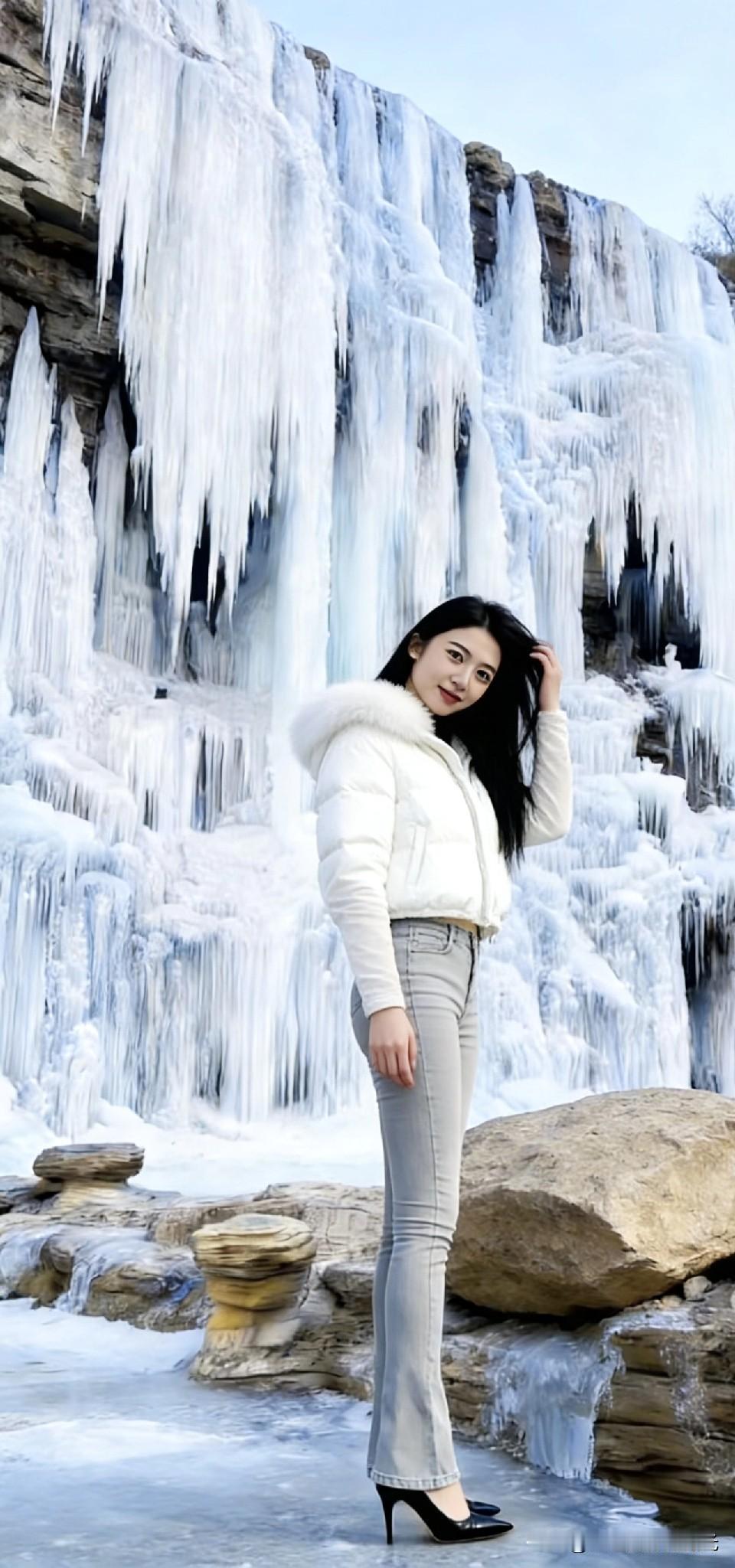 冬日冰瀑下的时尚少女,暖阳下的唯美瞬间