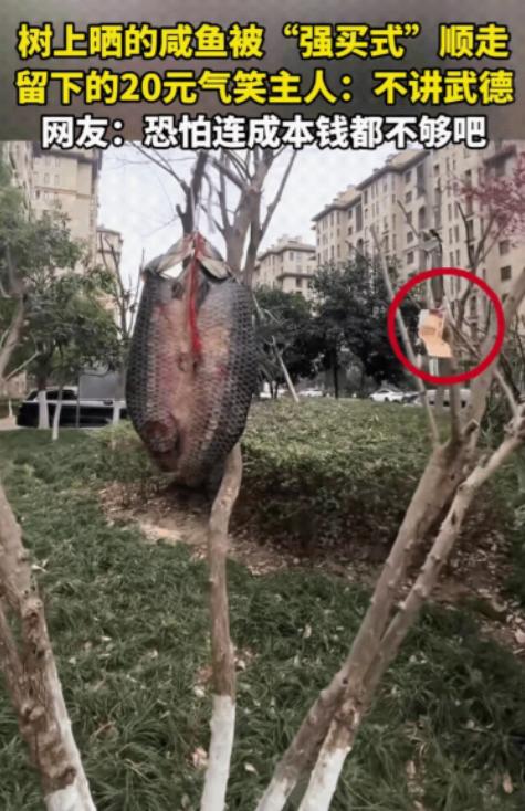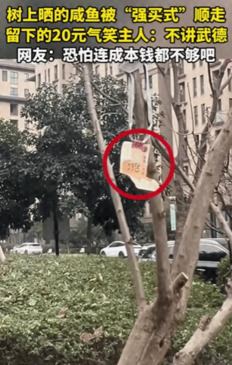 “笑不活了!”浙江,一女子在小区树上晒腊肉,谁知,等女子准备收回家时,却发现腊鱼少了一条,但是在挂腊鱼的钩子上挂着20块钱,女子看后哭笑不得,因为20块钱别说买一条腊鱼了,就是一条鲜鱼都买不到!网友:给你留20块钱就不错了! 年关将至的浙江,街头巷尾总能撞见藏着浓浓年味的画面,不管是古镇廊檐下挂满的酱肉鱼干,还是普通小区里居民寻个通风的树杈晒起的腊味,都裹着江南冬日独有的烟火气。 浙江人冬日晒腊味的习惯刻在骨子里,从绍兴安昌古镇传承千年的酱腊味制作,到普通人家亲手腌制的腊鱼腊肉,这抹咸香既是对新年的期盼,也是冬日里最实在的美味。 一女子趁着天气晴好,把自家亲手腌制的腊肉和腊鱼收拾妥当,找了小区里一棵通风的树,用钩子挂在树枝上晾晒。 就这样晒了几天,女子估摸着腊味的口感差不多了,便趁着午后的时间去小区树下准备收回家,可走到树底下的那一刻,她一下子愣住了。 挂在树枝上的腊肉整整齐齐都在,却少了一条精心腌制的腊鱼,空荡荡的钩子在风里轻轻晃着,女子第一反应还以为是被风吹走了,赶紧在树下找了一圈,可连腊鱼的影子都没看见。 就在她纳闷不已的时候,眼角余光瞥见了挂腊鱼的钩子上,竟然夹着一张20 块钱现金,那一刻女子的心情瞬间复杂起来,从纳闷到无奈,最后忍不住笑出了声,哭笑不得的情绪溢于言表。 她拿着这 20 块钱,心里满是感慨,别说这 20 块钱买不到自己亲手做的腊鱼了,就算是在菜市场买一条新鲜的草鱼,这点钱都远远不够,这突如其来的 “强买” 操作,实在让她不知该说什么好。 女子把自己的经历分享到了网上,还配上了树下钩子和 20 块钱的照片,没想到一下子引发了网友的热议,这桩 “腊鱼被顺走留 20 块” 的趣事,很快就成了大家冬日里的乐子。 其实这样的 “强买式” 顺走腊味的情况,近来并不是个例,湖北有女子在楼顶晒腊肉,少了一块却被留下 20 块钱,当事人直言 “说他偷吧留钱了,买吧我又没同意” 更有网友结合当下的物价调侃 “别说腊鱼了,现在买条小鲫鱼都不止 20,这位顺鱼的朋友怕不是活在十年前”。 当然也有网友开启了趣味调侃模式,有人说 “给你留 20 块钱就不错了,好歹没白拿,算是讲点江湖规矩”。 女子的经历也在小区的业主群里引发了热烈讨论,邻居们纷纷被这桩趣事逗笑,有人安慰女子 “好歹没白丢,留了点钱,就当是被馋嘴的邻居尝了鲜”。 也有邻居贴心提醒 “下次还是把腊味晒在自家阳台或者窗台上吧,小区里人来人往,挂在树上确实容易被惦记”。 还有邻居开玩笑说,以后小区里晒腊味的街坊,都可以在旁边挂个小牌子,写上价格,省得再出现这种 “强行定价” 的情况。 女子自己也在群里打趣,说这次算是长了教训,下次不仅要把腊味晒在自家视野里,还要真的准备个收款码,应对这种突如其来的 “强买”。 在浙江,冬日晒腊味本就是一件充满生活气息的事,从古镇里商户们专业的制作晾晒,到普通人家的随手操作,这份腊香里藏着的是对新年的美好期许,也是江南人对生活的热爱。 对于这件事,您有什么想说的吗?欢迎评论区留言讨论。