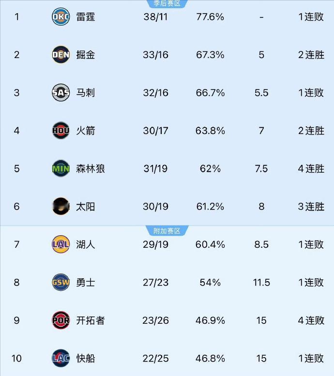 西部第7,湖人掉入附加赛! 4、火箭:30胜17负,7 5、森林狼:31胜19负,7.5 6、太阳:30胜19负,8 7、湖人:29胜19负,8.5 8、勇士:27胜23负,11.5 输给尼克斯之后,湖人的负场数和森林狼,太阳持平,湖人目前比赛少,胜场数不够,因此被太阳反超,掉到西部第7。 此前湖人曾经短暂的掉入过附加赛,但随后也是太阳输球,又把湖人送回西部第6。 这一次情况相同,湖人和太阳的比赛相隔1个小时,太阳如果不敌快船,湖人又会回到西部第6,但如果太阳主场赢球,那湖人就可以坐稳西部第7了,至少在下一场比赛来临之前,都是个附加赛球队。