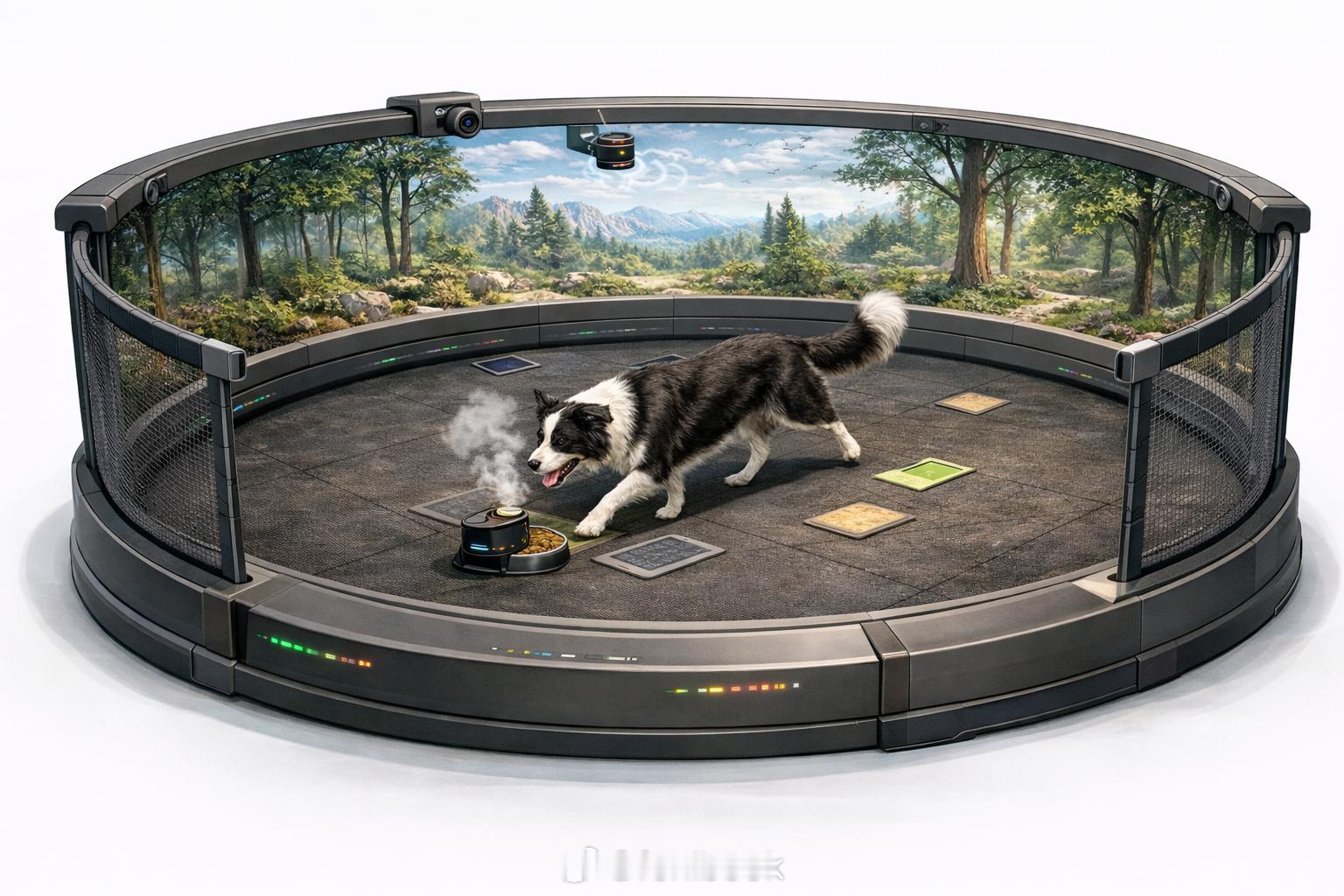 赛博遛狗机,360度全向跑步机,周围包裹一圈屏幕,可以播放任何外界环境,并且会有真实移动的感觉,狗的嗅觉很灵敏,所以增加气味模拟器,模拟外界真是气味,还有激光测速,实时调整跑步机速度来匹配狗的速度