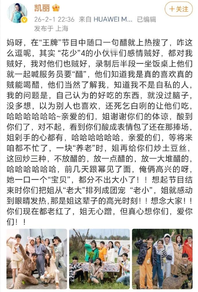 一看就是张凯丽自己写的 凯丽姐的文字太有她的范儿了🤣!长文一看就是自己写的,王牌澄清花少做菜放醋争议后,深夜发长文回应,超鲜活,诚恳认识到问题,坦言自己觉得好吃就硬让别人吃,还喊话花少的大家! 王牌对王牌