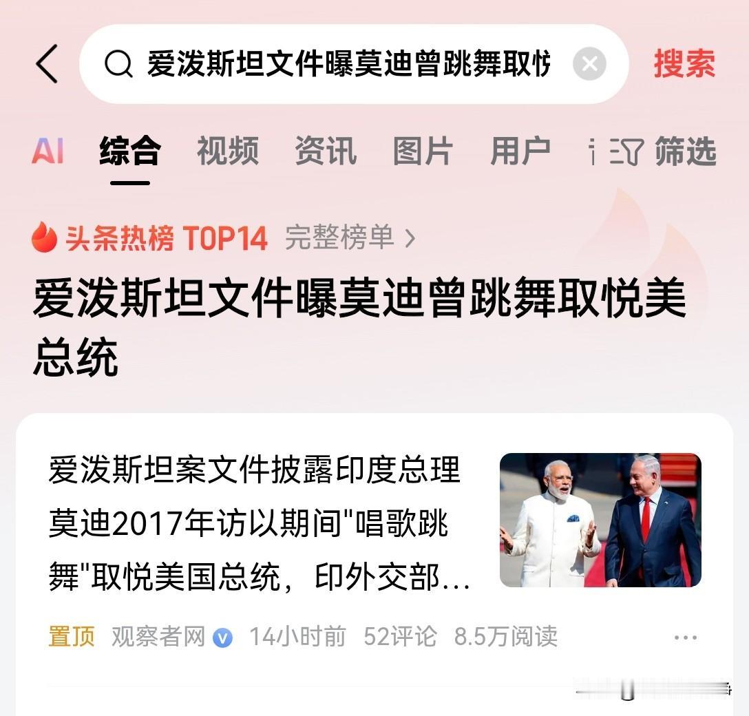 有点意思啊,想当年赵王为秦王击缶。 现如今莫迪给特朗普跳舞。 谁都没有想到,爱泼斯坦的文件里面居然把莫迪老仙给拽出来了。 绝密文件里面披露,2017年,莫迪老仙访问以色列期间曾经会见了特朗普。 结果他给特朗普唱歌跳舞来取悦美国总统。 反正这个事情怎么说呢,肯定是有损印度的国格的。 但是印度人嘛也是可以理解的,他们那帮人没事就唱歌跳舞。 可能是咖喱吃多了,有点烧心,有点兴奋。 老仙都那么大岁数了,居然还给懂王唱歌跳舞献媚。 哎呀,那个画面真的不敢想象。