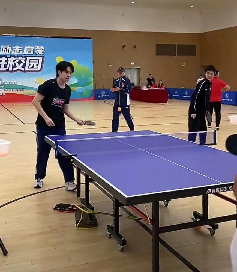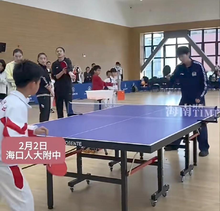 王曼昱、王楚钦今日在海口人大附中实验学校参加国球进校园活动,现场与学校师生互动打乒乓球。两人还是去年亚洲杯单打冠军。 期待今年两人继续取得好成绩。 同行队友还有徐奕、陈熠、王晓彤、牛冠凯、陈俊峰等人。