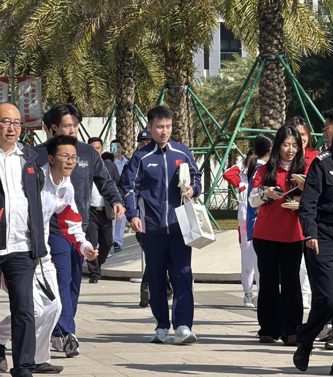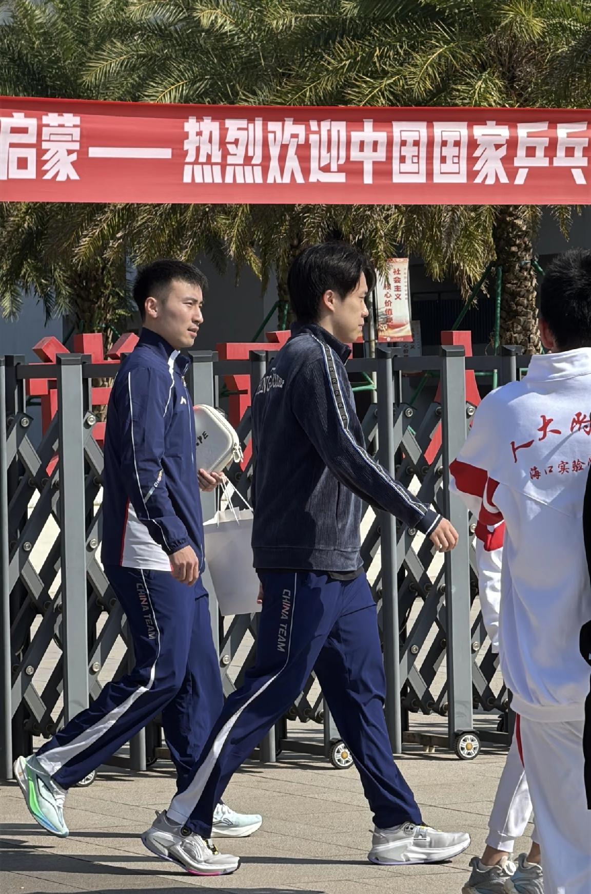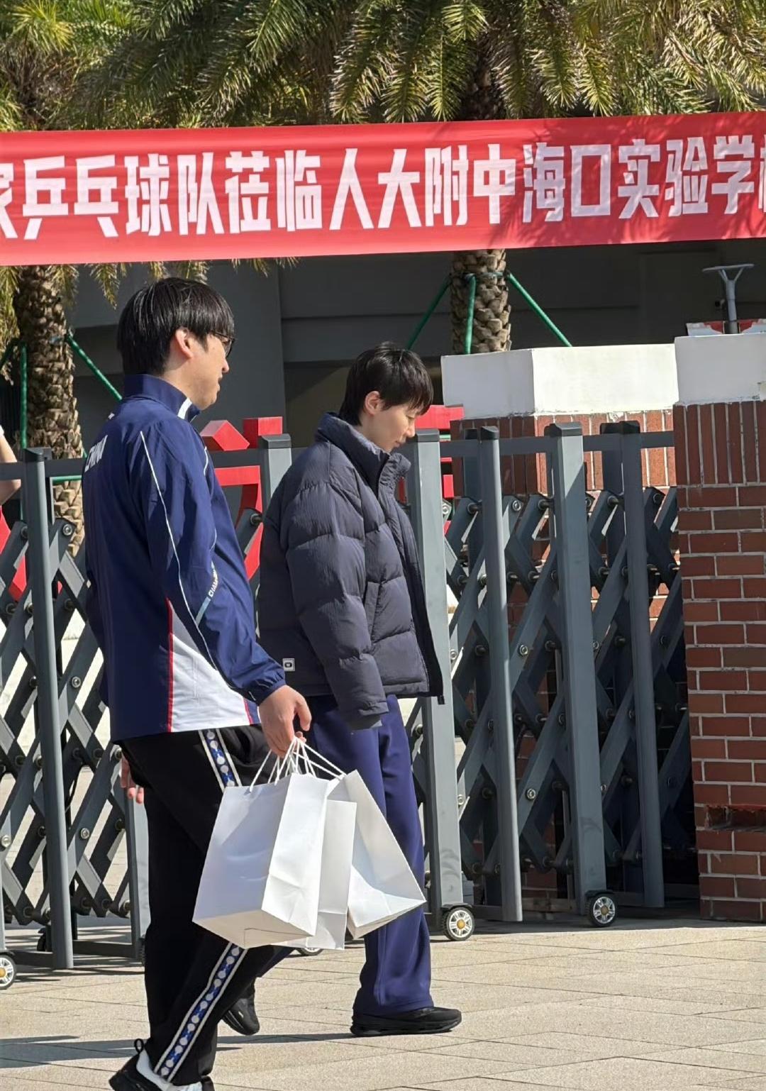 王曼昱王楚钦今日海口参加国球进校园活动,活动结束后离场,乘坐大巴车返回酒店。 王曼昱很会保暖,穿着羽绒服。王楚钦则是单薄一件运动服。 两人在人大附中海口实验学校参加活动,与学校师生互动打乒乓球,期间还收获学校的活动小礼物。