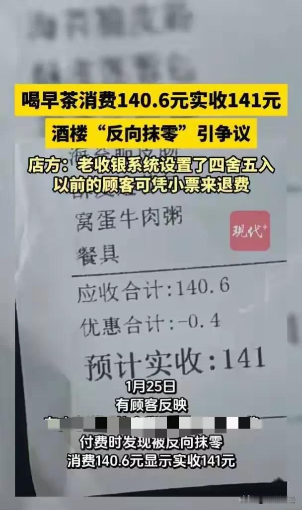 广东湛江,男子在酒楼喝完早茶,一共消费140.6元,付费时却被前台“反向抹零”,收了141元,男子感到意外将此事曝光。饭店负责人解释称,因收银系统设置了四舍五入,未能及时升级,希望大家能体谅这个小小的过失。网友:说不在意的都是有钱人。 对于广东人来说,美好的一天是从喝早茶开始的。对早茶的执念,也是刻在骨子里的生活仪式。 男子像往常一样来到当地一家酒楼,这家酒楼已经开了26年,在当地也算是小有名气,男子也是这家酒楼的常客。 海苔脆皮肠、窝蛋牛肉粥……这两三样菜品都是男子最喜欢的。送完餐后,男子悠闲的享受着美食,只有在这个时候,他才能体会到难能可贵的松弛感。 吃饱喝足,男子又在酒楼里休息了一会儿才去前台结账,服务员在电脑上一阵操作后,微笑着告诉男子,本次消费一共141元。 男子听完没有任何犹豫便掏出手机付款,付完款之后,前台服务员将消费小票交给男子。 可千万不要小看这一张小小的纸,如果日后产生纠纷,这都将成为一份强有力的物证。 依据《中华人民共和国发票管理办法》第十九条 规定,销售商品、提供服务以及从事其他经营活动的单位和个人,对外发生经营业务收取款项,收款方应当向付款方开具发票;特殊情况下,由付款方向收款方开具发票。 案例中的男子就非常重视保存这类消费小票,不仅如此,他还有“对账”的习惯。 以他点的菜品一共才140块钱,在广东来说消费并不算太高,单一菜品的价格也相对合理,唯独最后的金额,让男子陷入了沉思。 根据各个菜品的总和,应该是140.6元,可就在刚才,前台明明收了他141块钱。 看到这里,相信很多网友也会感到有些意外。无论是家庭聚餐还是朋友聚会,只要是在饭店吃饭,最后结账的时候如果有几块几毛的,饭店基本上都会给“抹零”。 这次男子也被抹零了,不过却是反向抹零,他被前台给“四舍五入”了,多收了0.4元。 四毛钱确实不太多,连一根棒棒糖都买不到,却是实打实的违法行为。 根据《价格法》第四十一条规定,经营者因价格违法行为致消费者多付价款的,应当退还多付部分;造成损害的,依法承担赔偿责任。 男子消费了140.6元,却被收取了141元,其中的0.4元属于多付的,且男子还不知情,商家的行为实际上已经违法了。 不过男子也根本就不在乎,只不过酒楼的这种行为,让男子感觉有些不爽,于是便把自己的经历发布在了网络上。 酒楼的店长很快便发现了此事,及时通过社交平台对此事进行回应。 这名店长表示,自己刚来这家酒楼的时间并不长,在了解情况之后,发现酒楼的收银系统设置了四舍五入,由于系统并没有升级,所以才出现了这样的情况。 另外这名店长还表示,出现这样的情况确实是酒店工作存在疏忽,一方面是因为对员工的培训不到位,另一方面是旧的收银系统没有及时进进行升级。 目前已经停止了这种收费方式,被多收费的顾客可以凭借消费小票进行退费。 除此之外,店长也向广大网友真诚的道歉,希望广大网友能够原谅这一次小小的过失,陪伴这一家长达26年的餐饮品牌共同成长。 不得不说,店长的解释很及时也很诚恳,可有些网友却并不买账。 谁的钱都不是大风刮来的,一次被多收费几毛钱,看着确实不多,可如果酒楼的生意好,客流量也大,长此以往这笔钱可不是一个小数目。 最最关键的问题,酒楼作为经营者,“四舍五入”的收费方式存在时间也不是一天两天了,为什么一直没有发现? 或者是发现了也没有人提?哪怕就是多收费,最起码也应该明确告知消费者,而不是等着消费者自己去发现。 不过也有人表示,现在做生意也不容易,更何况一顿饭一百多块钱,并不贵。 对此你怎么认为呢?