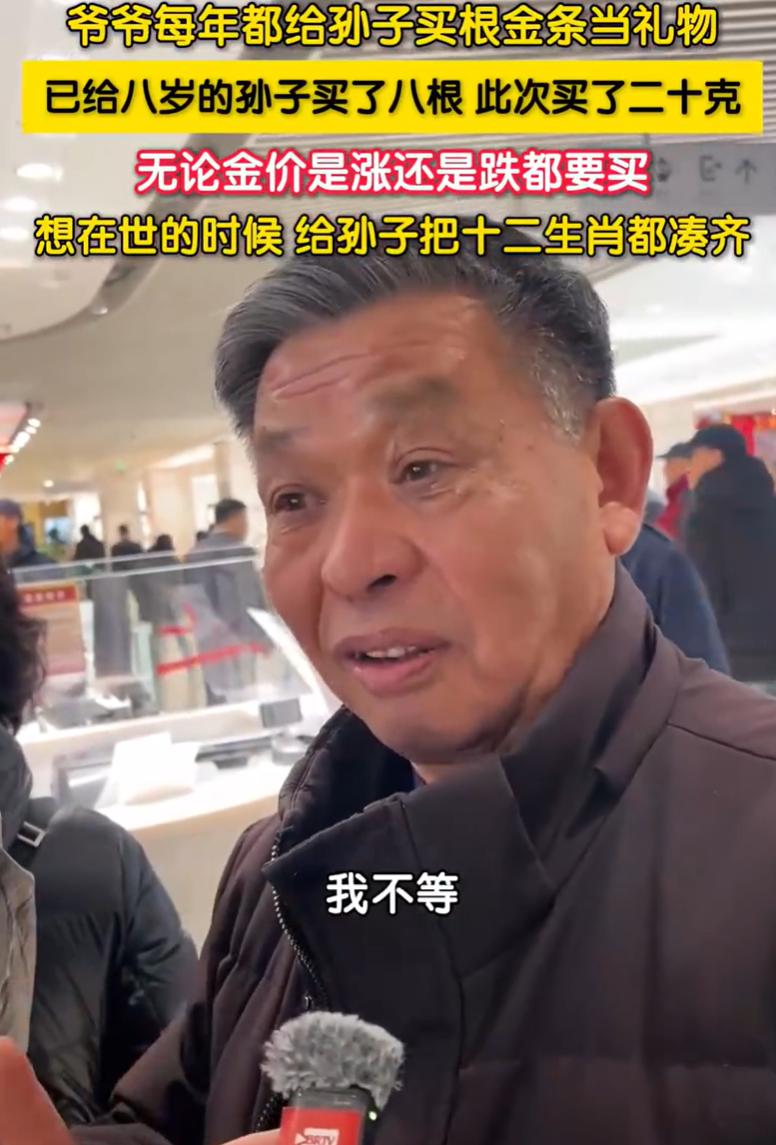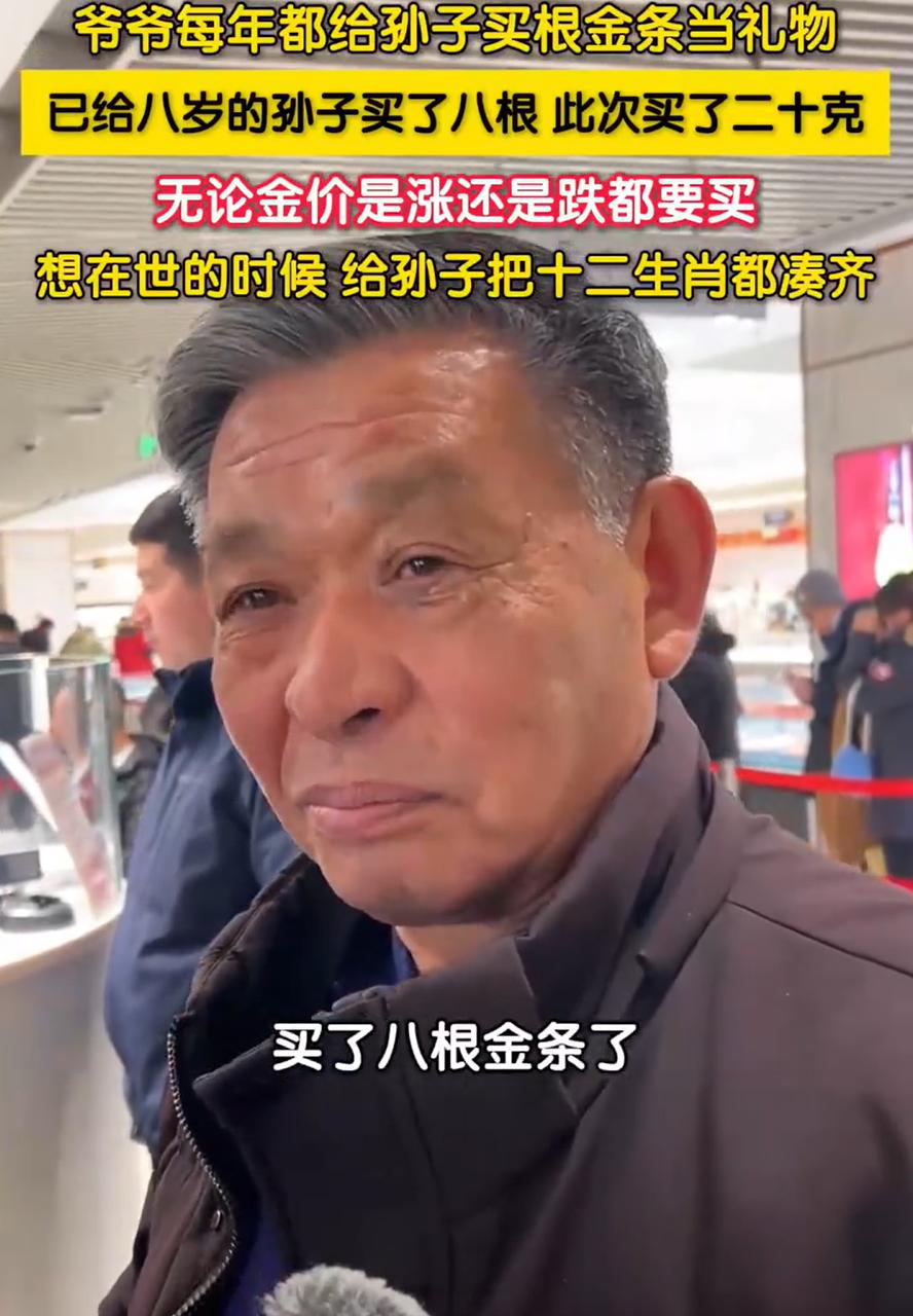 真清醒!北京,一位爷爷去商场给孙子买金条当过年礼物,有人问他为什么不等等便宜了再买, 爷爷却表示:我不等,无论是涨了还是跌了我都要买,就想在世的时候给孩子们留点东西 这位爷爷介绍,他每年过年前都会给孙子买一根金条,目前孩子8岁,他也已经买了8根,此次买了一根20克的金条,他的目标是自己在世时,能给孩子凑齐一套12生肖 有人问他现在金价是不是高了,这位爷爷回答确实比往年高了很多,可当别人建议他再等等时,爷爷说很坚定的说:我不等,涨了也买,跌了也买,只要我还在,就每年给孩子留一点 有人可能觉得这位爷爷固执,不懂理财,但仔细想想,这份“不等”背后,其实藏着一份很清醒的活法 金价涨跌是市场的事,而给孙子的礼物,是家事。他不愿意把这两件事混在一起。在他的心里,有些东西的价值,本来就不该用价格去衡量 年龄大了的人,对时间有种特别的敏感。他们知道承诺不能总寄托于“以后”,有些事现在不做,可能就真的没机会了。这份礼物最大的意义,不在于它是金子,而在于它每年如期而至,在于爷爷还能亲自把它交到孙子手里的那些年
