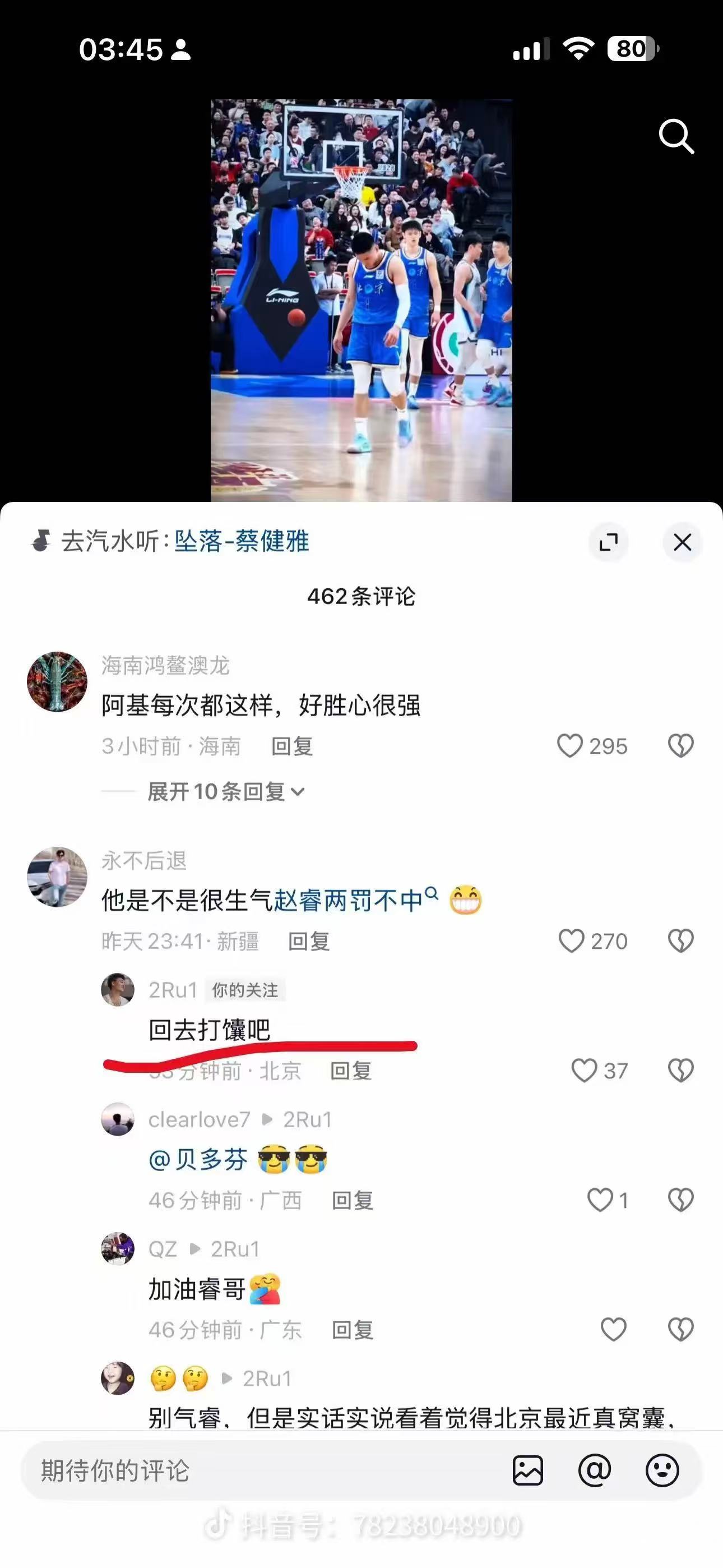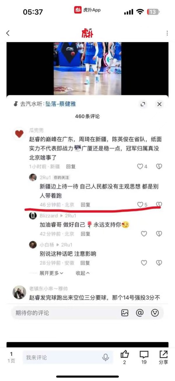 昨晚北京队爆冷输给青岛,估计全队都比较郁闷,赵睿在网上还跟新疆球迷互怼起来,赵睿加盟北京,新疆球迷一直耿耿于怀。一个IP新疆的网友在评论区发言:“赵睿巅峰在广东,周琦在新疆,陈盈骏在省队,纸面实力不代表即战力,广厦还是稳一点,冠军归属真没北京啥事了。”其实这条网友的评论并没有什么过激的表述,赵睿却回了这条评论:“新疆边上待一待,自己人民都没有主观思想,都别人带着跑。”赵睿这样说确实有点欠考虑了。