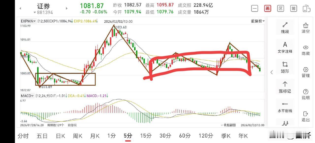 聊聊证券板块(2026.2.2) 今天证券板块早盘冲高回落,其实这里走势是非常简单的,春节前就是在30分钟中枢区间上下震荡,不会有什么亮点,但也不会出现糟糕的走势,总体无忧。 1.从30分钟图一上看,早盘半小时量价关系是异常的,下午是极有可能会破早盘的低点的,但这里不会出现大的风险,就是一个区间震荡过程,如果要发动行情,至少还得走4笔30分钟才有可能。所以耐心等着吧!或许旺旺队就是在压慢节奏,急是急不来的。 2.从5分钟图二上看,目前构建了一个5分钟的下跌中枢,这个中枢应该会有离开段,所以下午是会破早盘的低点的,但下去的幅度并不大, 反而是回补仓位的好机会。目前手中还有三成仓位,下午在1073.89点附近可再次考虑回补仓位至满仓。 3.商业航天妖龙今天拉出大阳线,下午开盘可考虑减一点仓位,当在5分钟上出现大阴线时,可考虑回补仓位,做一波差价,总体而言,该板块依然是机会大于风险,无忧!股市底部探讨 证券板块动态