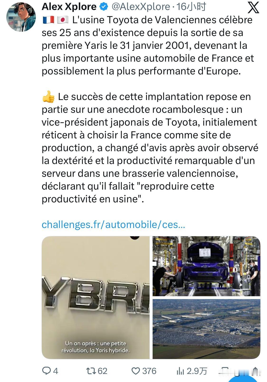 位于法国瓦朗谢讷的丰田汽车工厂正在庆祝其成立 25 周年,自 2001 年 1 月 31 日发布第一辆 Yaris 以来,该工厂已成为法国最大的汽车工厂,也可能是欧洲效率最高的汽车工厂。 该项目的成功部分基于一个离奇的轶事:丰田汽车的一位日本副总裁最初不愿选择法国作为生产基地,但在瓦朗谢讷一家小酒馆里看到一位服务员的非凡灵巧和生产力后,改变了主意,并宣称有必要“在工厂里复制这种生产力”。 这是一个关于工业界和当地历史非常迷人的轶事! 瓦朗谢讷(Valenciennes)工厂(正式名称为 Toyota Motor Manufacturing France,简称 TMMF)的成功确实被认为是日本丰田精益生产方式(TPS)与法国本土活力完美融合的典范。 根据丰田欧洲官方新闻稿 (Toyota Europe Newsroom),以下是该工厂几个关键的里程碑: 开端与速度: 工厂于 2001 年 1 月 31 日正式投产。由于其高效的生产逻辑,它是丰田在全球范围内从动工到下线第一辆车速度最快的工厂之一。 法国最大: TMMF 多次被评为法国产量最大的汽车生产基地,这在很大程度归功于其畅销车型 Yaris 以及近年加入生产线的 Yaris Cross。 效率神话: 关于“小酒馆服务员”的故事在当地流传甚广。据说那位高管被服务员同时处理多个订单、穿梭于狭小空间且毫无差错的动作所打动,这正是丰田“准时制 (Just-in-Time)”和“自働化 (Jidoka)”在现实生活中的生动体现。 如今,这家位于翁南(Onnaing)的工厂不仅是该地区的经济支柱,也是丰田在欧洲实现混合动力转型和可持续生产的领头羊。