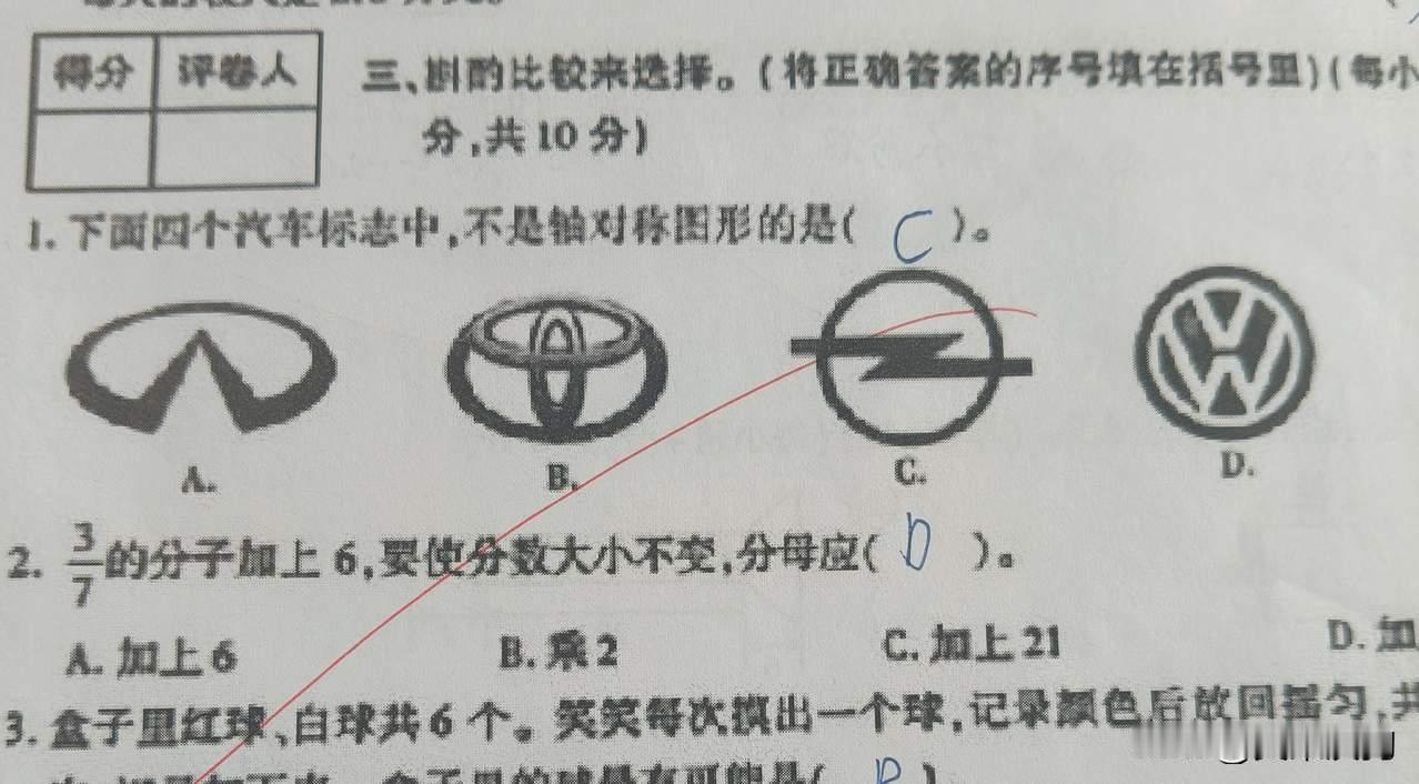 出题人的态度很重要,选择图片有多种选择时,选择国产车图标试卷更自信,文化自信! 教育,传递的是一种态度。一种对祖国的爱,发自内心的,时时刻刻的爱! 教师也好,出题人也好,他们的一言一行,都是向学生传达一种价值观,这种价值观是潜移默化影响孩子们的。 这两组题目,第二张外国品牌车标的我是在网上看到的,今天无意中翻看孩子试卷,发现他们用的试卷不仅是采用了国产车标,还想学生们讲述了国产新能源汽车的亮眼表现。